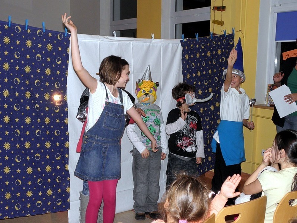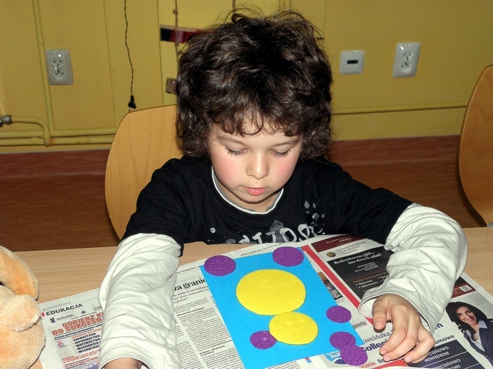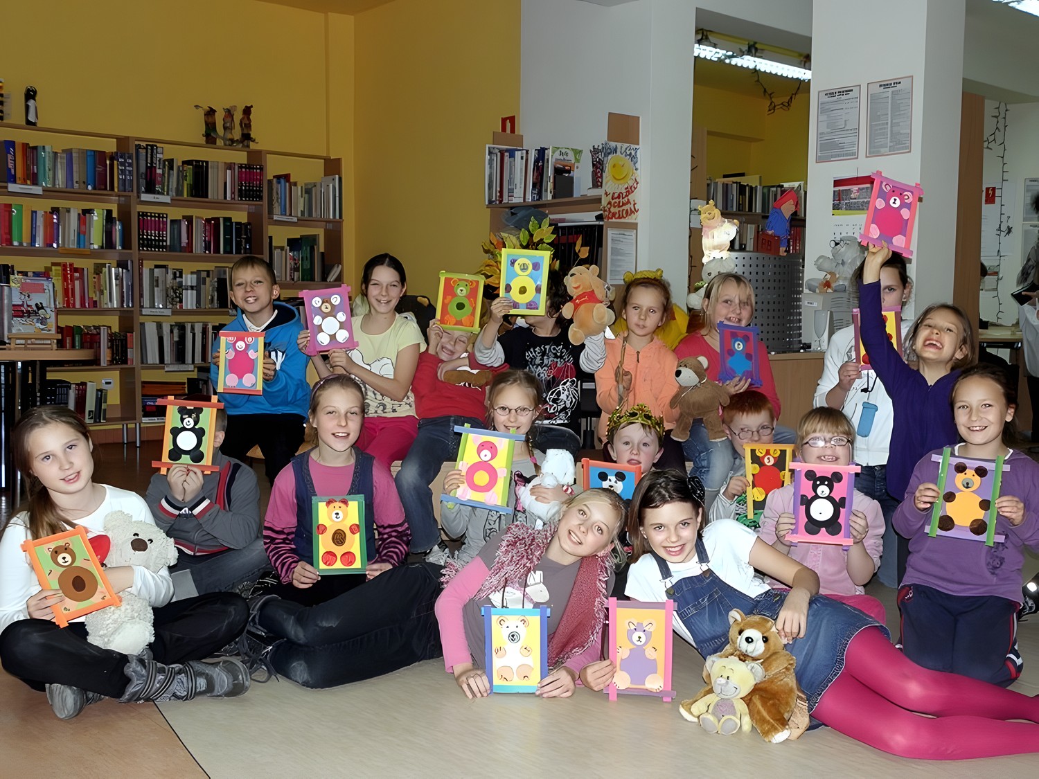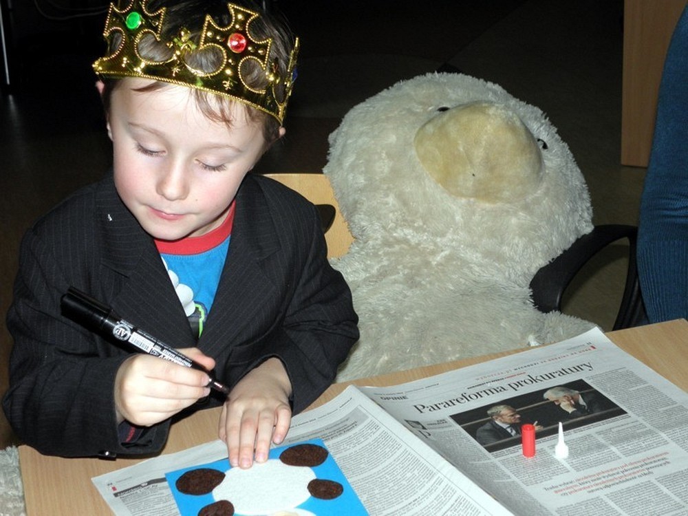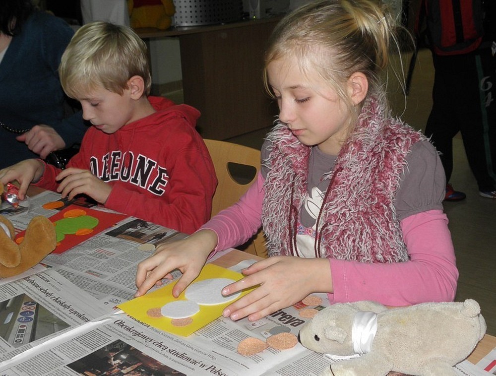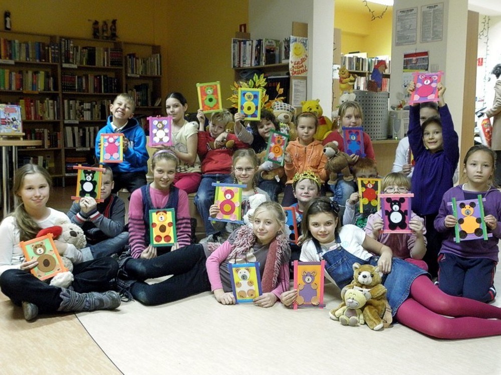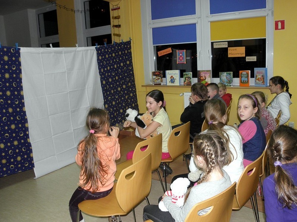 Zanim zrobi się gwarno jak w ulu, dzieci zasiadają na "widowni" w oczekiwaniu misiowych niespodzianek. Zaczynamy (panie Wiola i Ewa) od intrygującego wywiadu z Misiem Uszatkiem, a następnie scenką z udziałem dwóch angielskich gości - Kubusia Puchatka i Misia Paddingtona. To nie koniec teatralnych występów. Nadszedł czas dla dzieci - to one , pod kierunkiem pań, przygotowują w ekspresowym tempie teatrzyk cieni. Zmieniamy wystrój czytelni i z teatru robimy pracownię plastyczną. Dzieci wykonują Portret Misia, który zabiorą ze sobą na pamiątkę spotkania. No cóż, czas kończyć "misiową imprezkę" - jeszcze mała chwila na "wybuchowe" życzenia urodzinowe dla wszystkich pluszowych misiów na świecie...