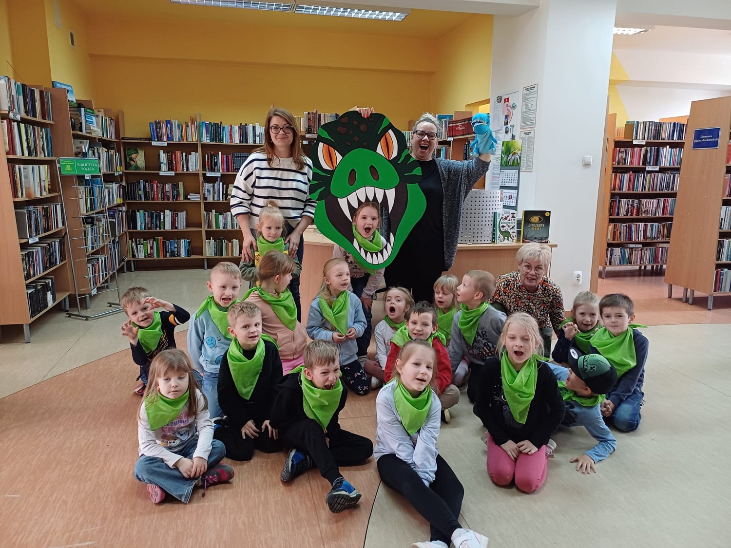 Kolejny dzień Tygodnia Bibliotek i w naszych progach witamy przesympatyczne LISKI i ZAJĄCZKI z Przedszkola JAŚ I MAŁGOSIA Tym razem zaprosiłyśmy dzieci na wielką przygodę z dinozaurami Przedszkolaki, doskonale przygotowane do spotkania, bezbłędnie podzieliły dinozaury na roślino i mięsożerne, nakarmiły cebulką T-rexa i doskonale naśladowały wywoływane przez Gosię dinusie Spotkanie było bardzo głośne, wesołe, edukacyjne oraz ... gimnastyczne, kiedy do zabawy dołączyła BLU