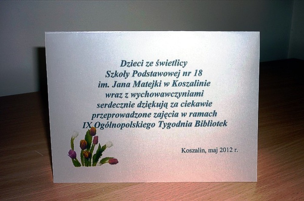 Drugi dzień Tygodnia Bibliotek (9 maja) obchodziliśmy wspólnie z dziećmi ze świetlicy Szkoły Podstawowej nr 18 w Koszalinie. Temat spotkania brzmiał: "Imieniny biblioteki - z książką przez wieki".