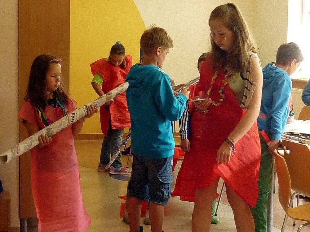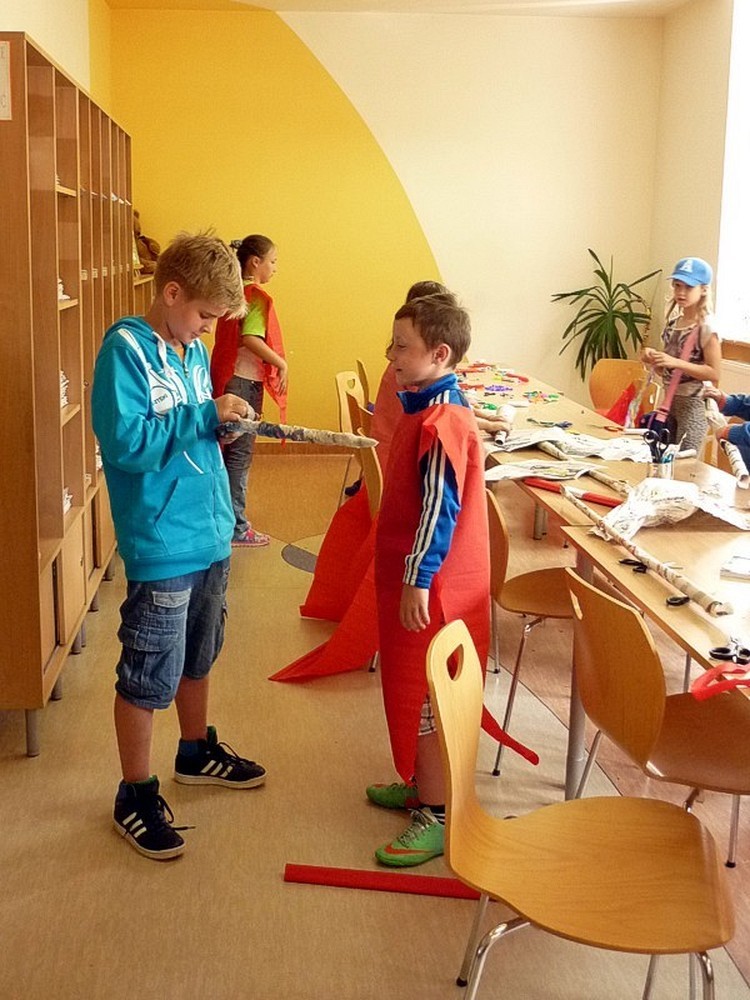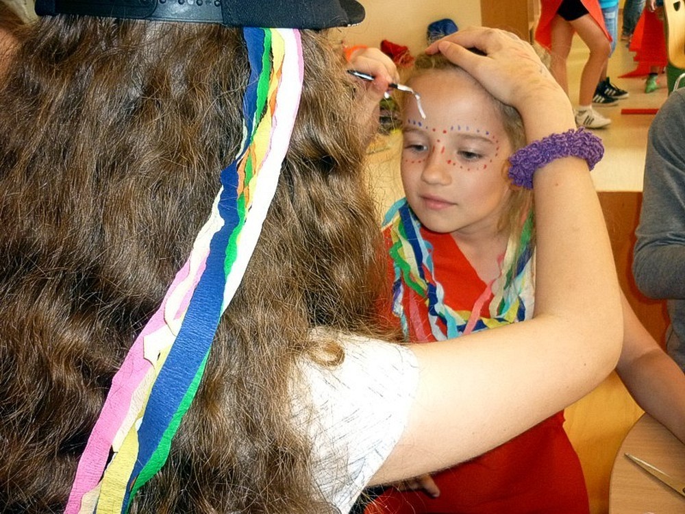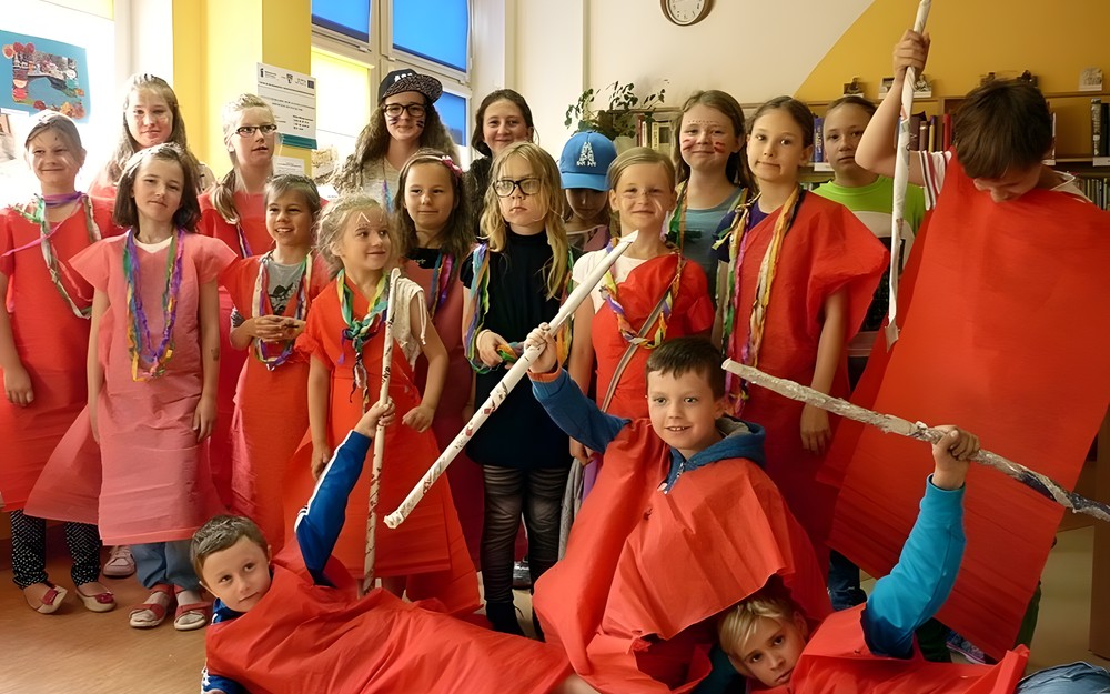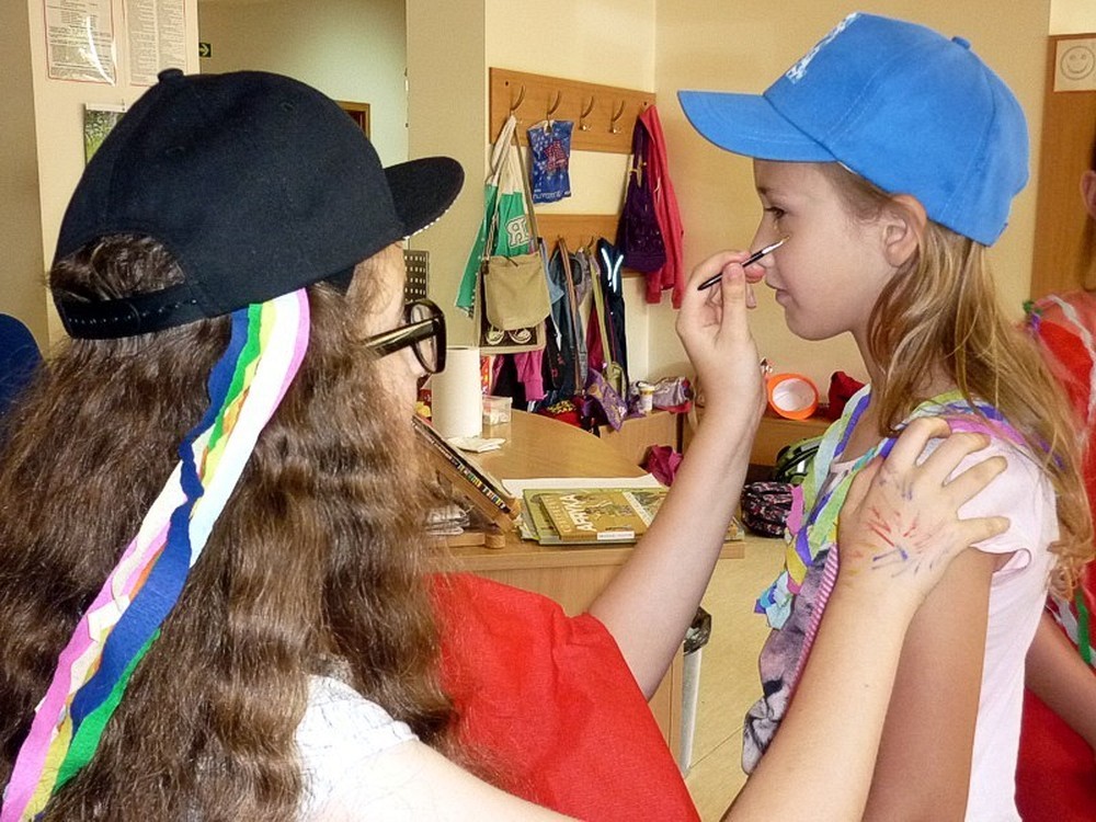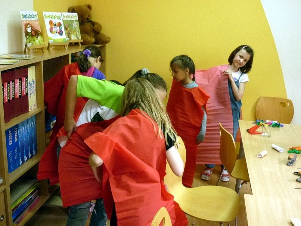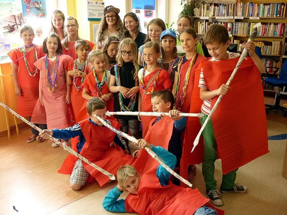 Dzisiejsze (9 lipca) zajęcia to była prawdziwa AFRYKA! DZIKA i NIEOKIEŁZNANA! Początkowo wyglądała niewinnie i spokojnie, kiedy siedzieliśmy zasłuchani w opowieści Pani Wioli o książkach. Jednak z każdą chwilą atmosfera stawała się coraz bardziej gorąca. Kiedy wędrowaliśmy "karawaną przez pustynię" emocje narastały... Zupełnie jakby jej uczestnikami byli głośni kupcy, udający się na słynny arabski SUK. Jednak to, co wydarzyło się w wiosce Masajów ukazało prawdziwe oblicze Afryki - kolorowe, głośne i rytmicznie rozedrgane w plemiennym tańcu masajskich wojowników.