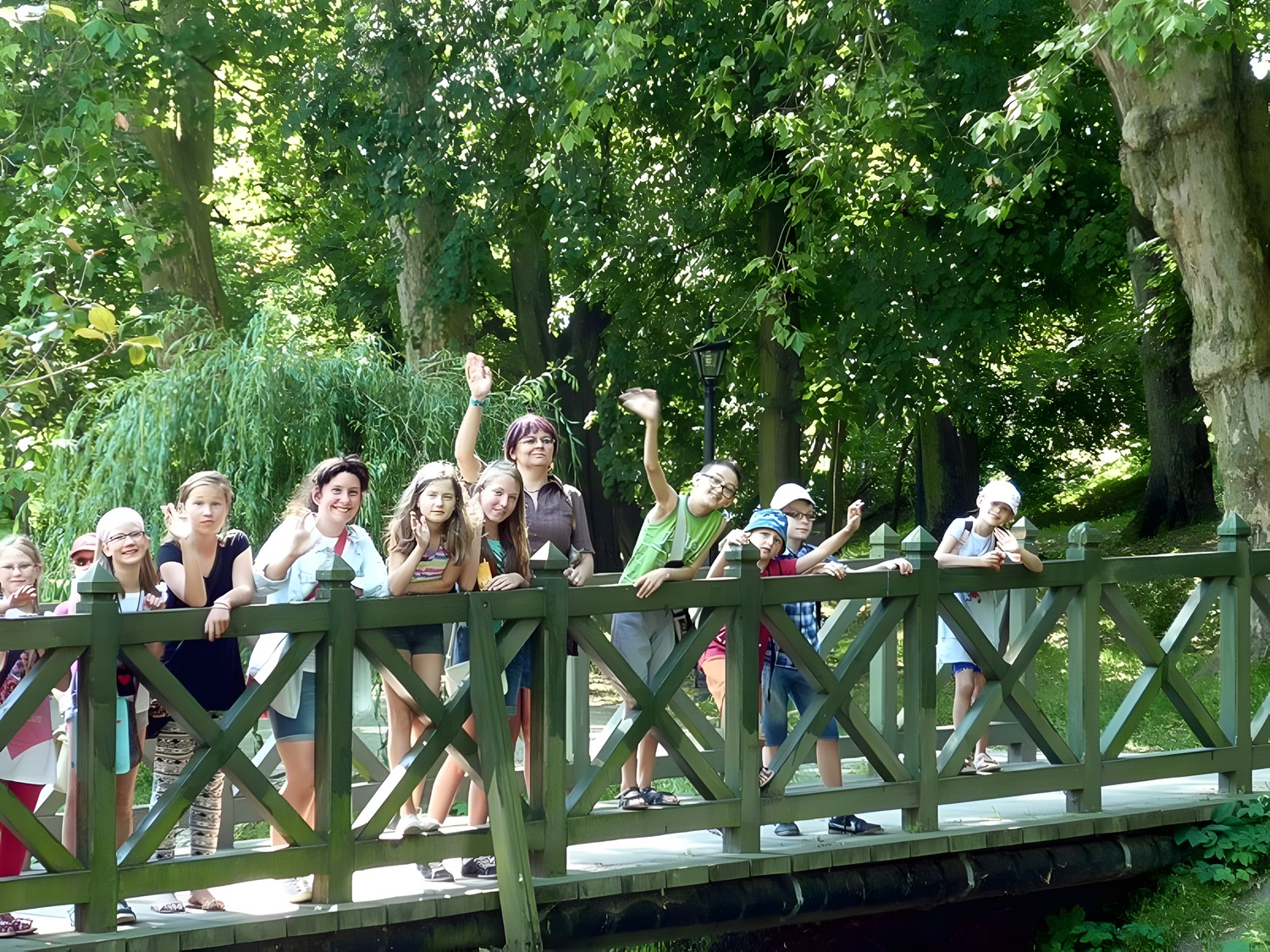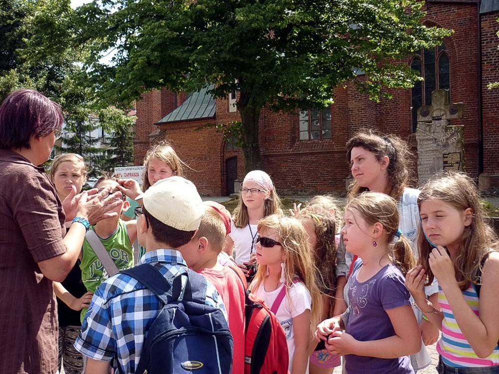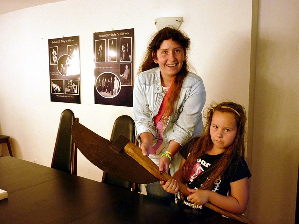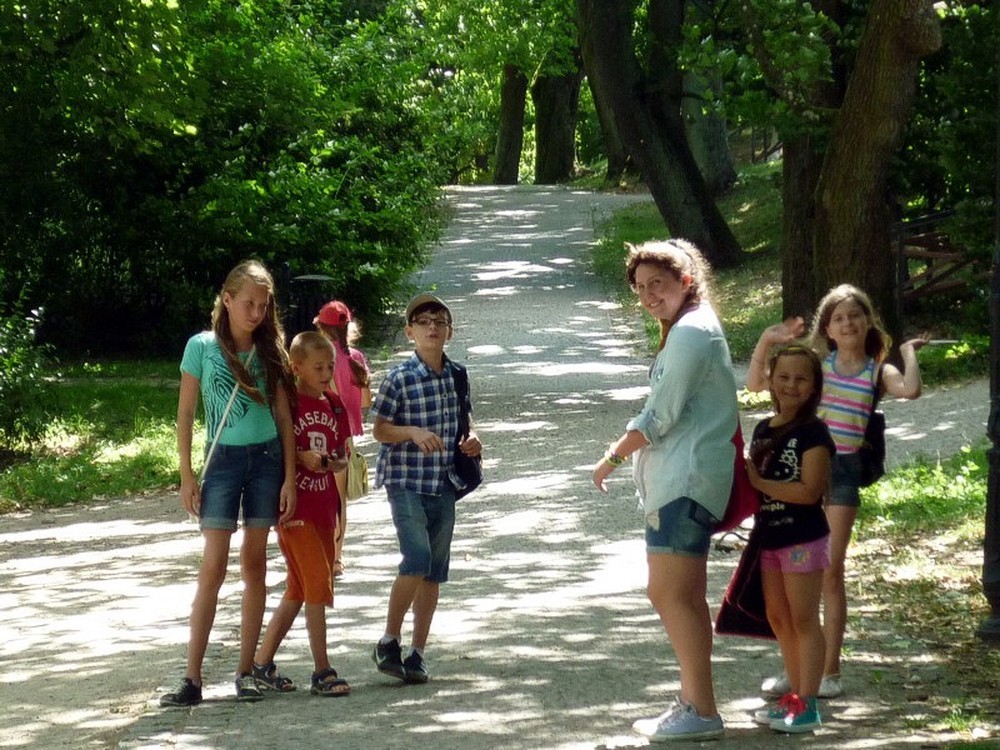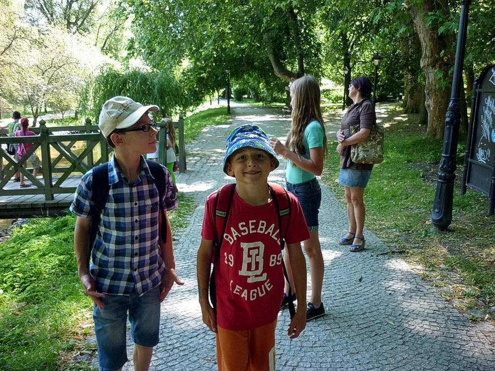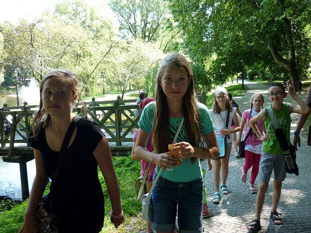 Po wizycie w muzeum, parkiem - wzdłuż średniowiecznych murów obronnych, udaliśmy się do zabytkowego Domku Kata. Tam na scenie teatru "Dialog" urządzliśmy sobie próbę "Kwoki" J. Brzechwy, a na górze - sesję fotograficzną w stroju kata. W drodze powrotnej, zmęczeni marszem i upałem, wstąpiliśmy do McDonald'sa. Uff! Wreszcie lody dla ochłody.