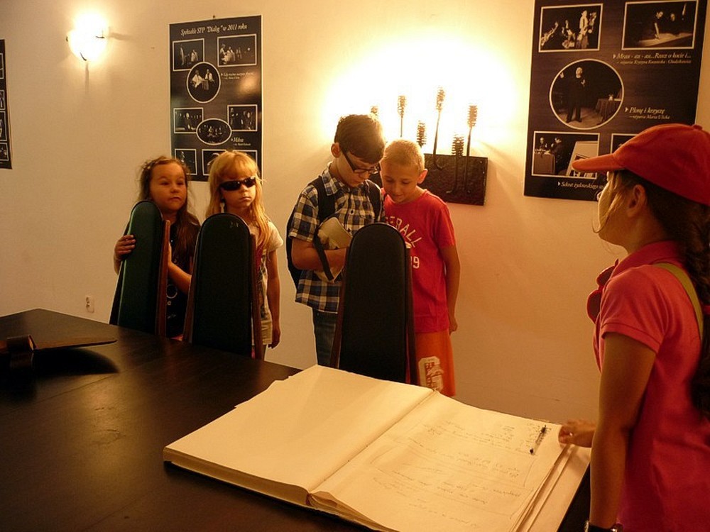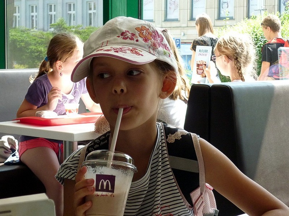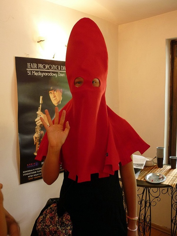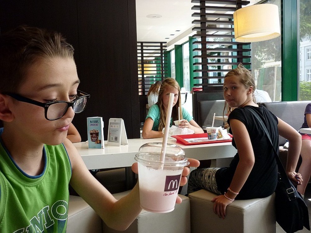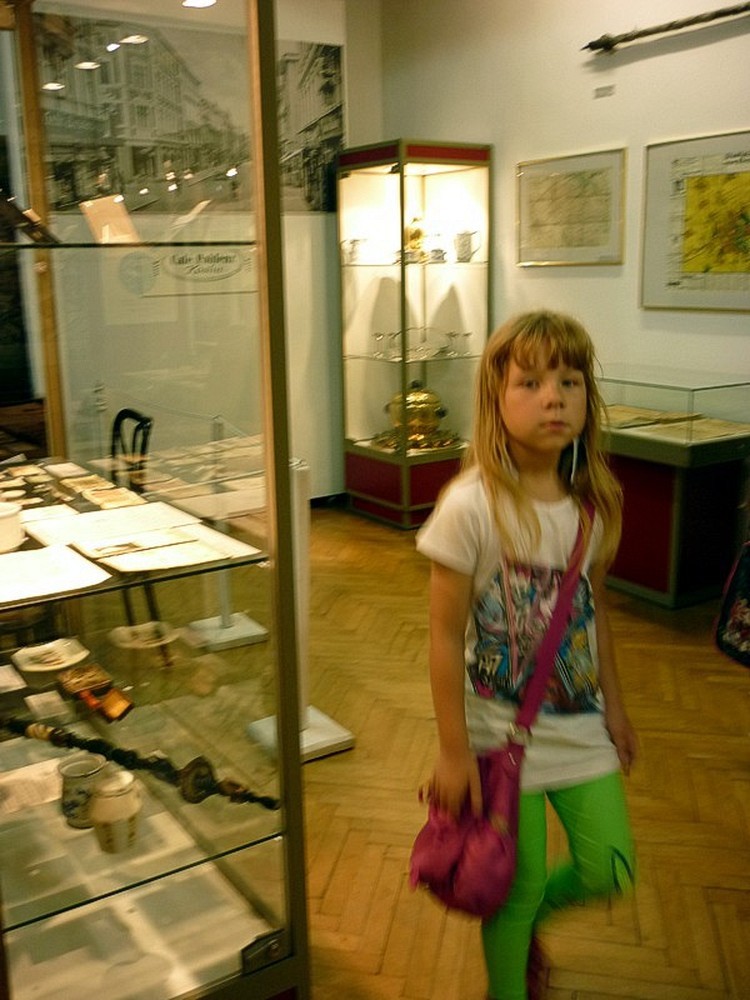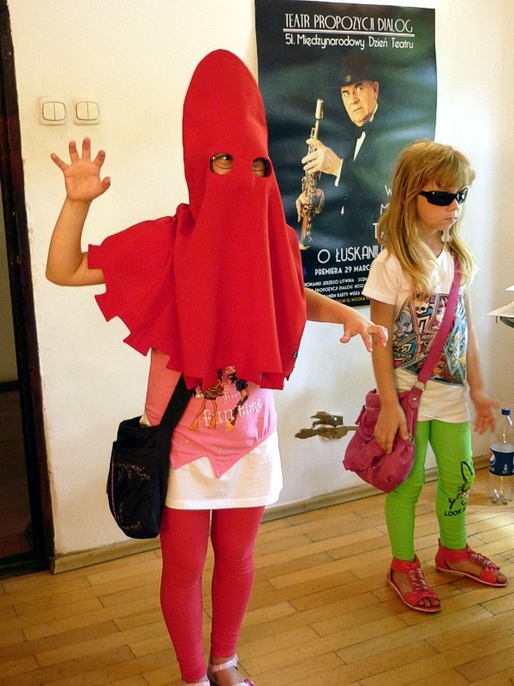Po wizycie w muzeum, parkiem - wzdłuż średniowiecznych murów obronnych, udaliśmy się do zabytkowego Domku Kata. Tam na scenie teatru "Dialog" urządzliśmy sobie próbę "Kwoki" J. Brzechwy, a na górze - sesję fotograficzną w stroju kata. W drodze powrotnej, zmęczeni marszem i upałem, wstąpiliśmy do McDonald'sa. Uff! Wreszcie lody dla ochłody.