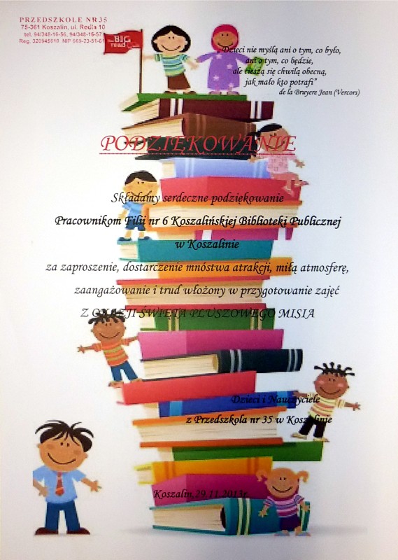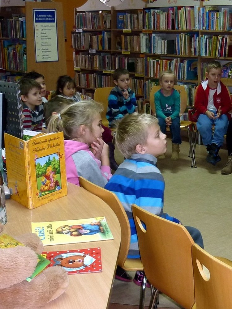 Na ostatnie spotkanie (29 listopada) z cyklu "Święto Pluszowego Misia" przybyły "NIEDŹWIADKI" z Przedszkola nr 35 w Koszalinie. Była to kolejna wizyta dzieci w naszej bibliotece. Ciekawostki z życia niedźwiedzi, historia książkowego misia, kilka wesołych zabaw oraz turniej układania puzzli, wypełniły czas sympatycznym "zerówkowiczom".