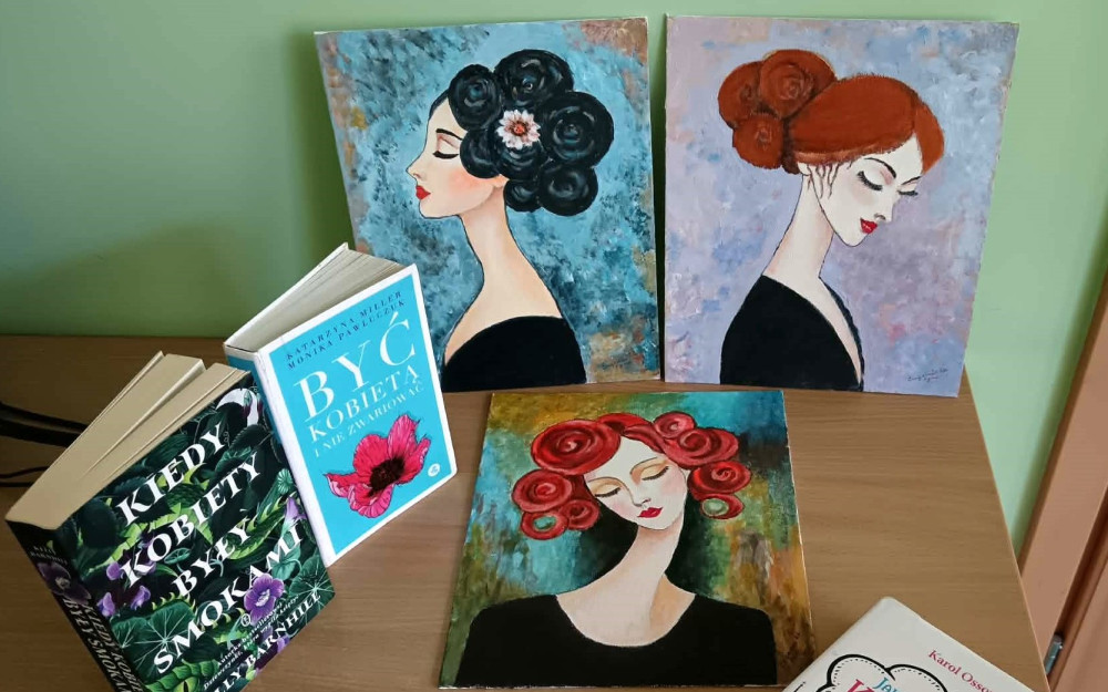 W witrynie wystawowej można podziwiać niezwykłe obrazy przedstawiające KOBIETY namalowane przez Nasze Czytelniczki Panią Danutę i Panią Eugenię. W swoich pracach obie Panie zastosowały różne techniki malarskie, nadając każdemu dziełu wyjątkowy charakter i niepowtarzalny klimat.