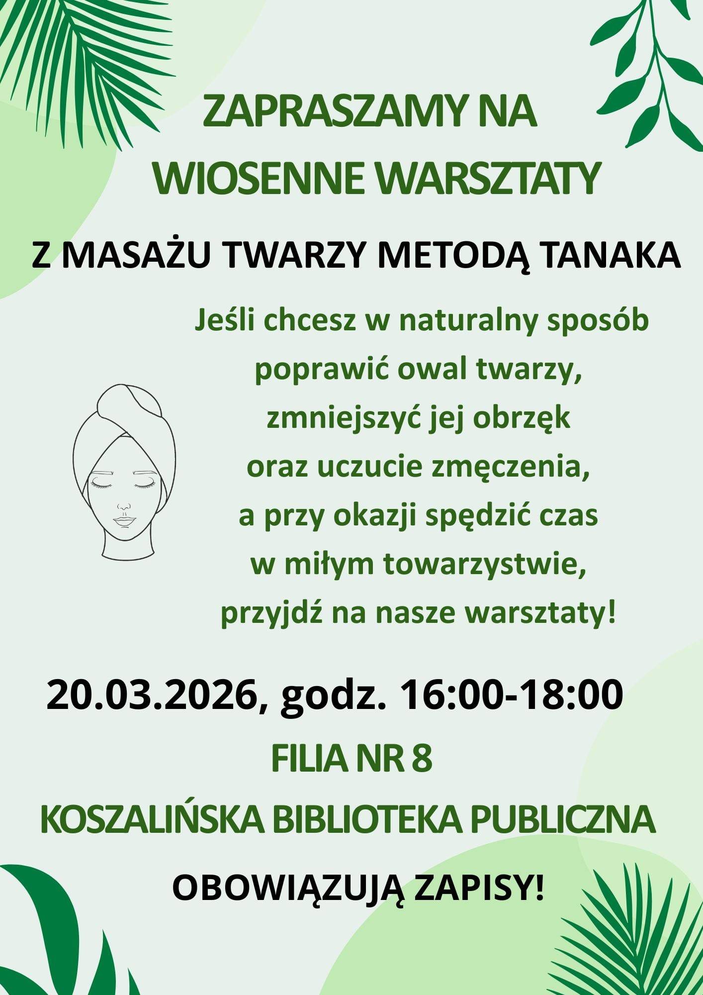 Marzec to idealny moment, by obudzić się razem z wiosną, poczuć świeżą energię i zadbać o siebie po zimie. Gdy dni stają się jaśniejsze, a przyroda budzi się do życia, warto zrobić coś dobrego także dla swojego samopoczucia. Jeśli szukasz przyjemnego sposobu na realizację swoich planów, serdecznie zapraszamy do naszej biblioteki na wiosenne warsztaty z masażu liftingującego twarzy metodą Tanaka. Podczas spotkania nauczysz się prawidłowych ruchów, które pobudzają krążenie i pomagają wygładzić rysy twarzy oraz przywrócić skórze naturalny blask. To nie tylko chwila relaksu, ale i świetna inwestycja w dobre samopoczucie.