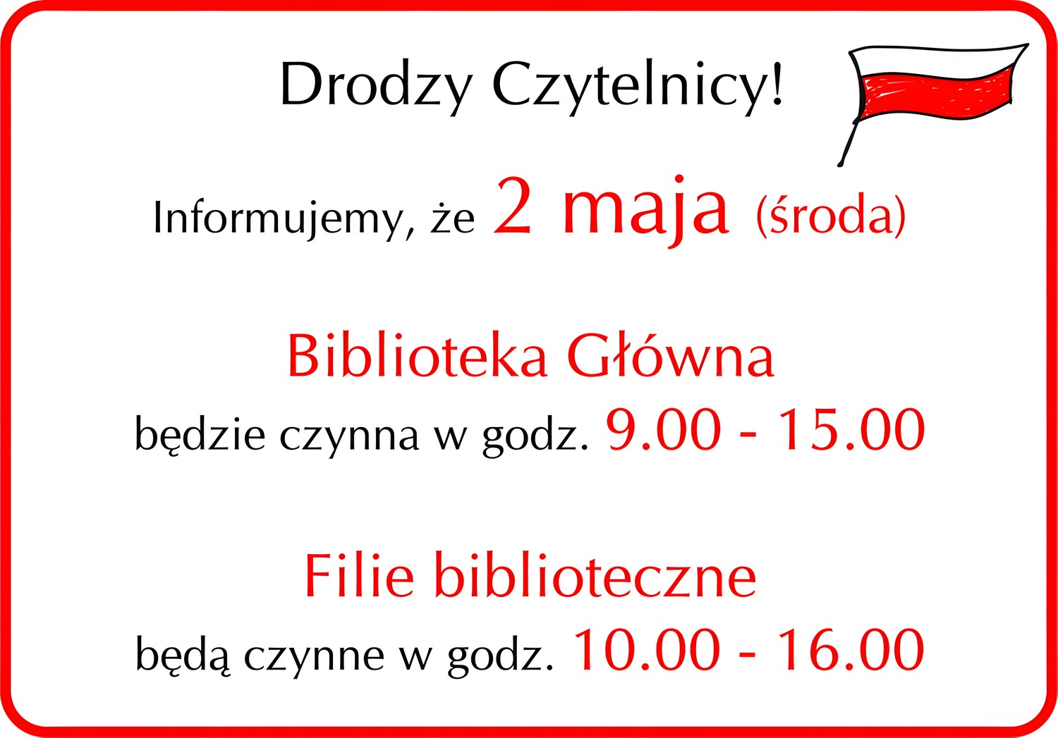 2 maja 2018 (środa) filia czynna w godz. 10.00 - 16.00.