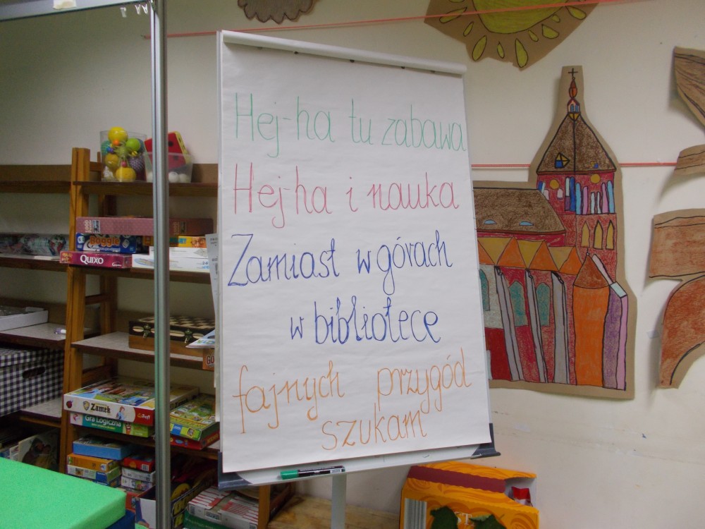Zajęcia w bibliotece pod hasłem "Zielono nam". Dzieciaki przypominają sobie na czym polega segregacja odpadów, poznają roślinność, również naszego ogrodu, uczą się letnich, zabawnych piosenek.