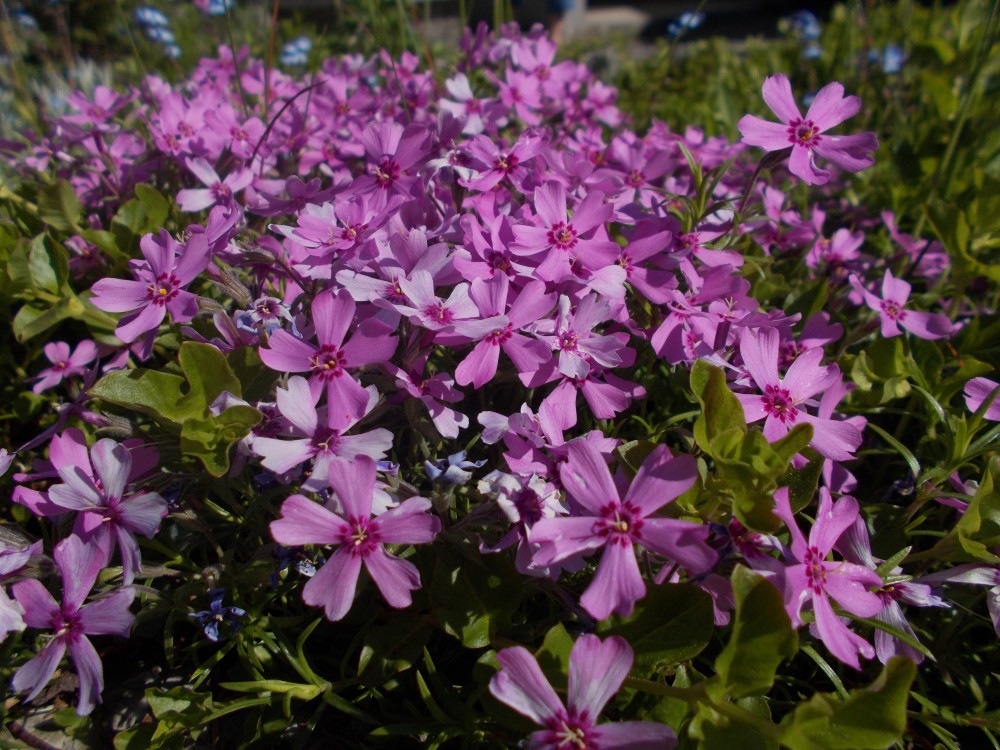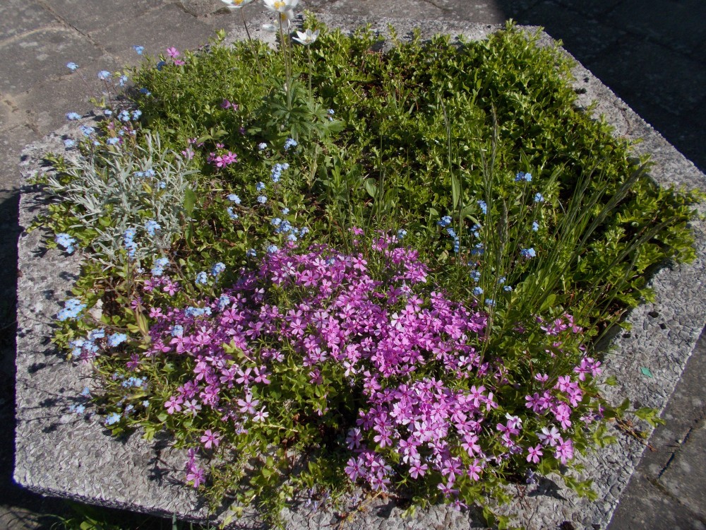 Nasza biblioteka otoczona jest zielenią traw, drzew i kolorowymi kwiatami.