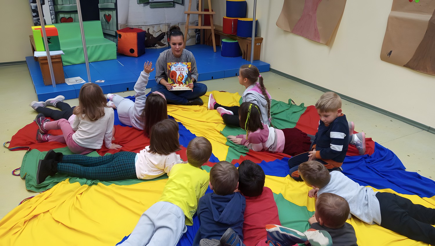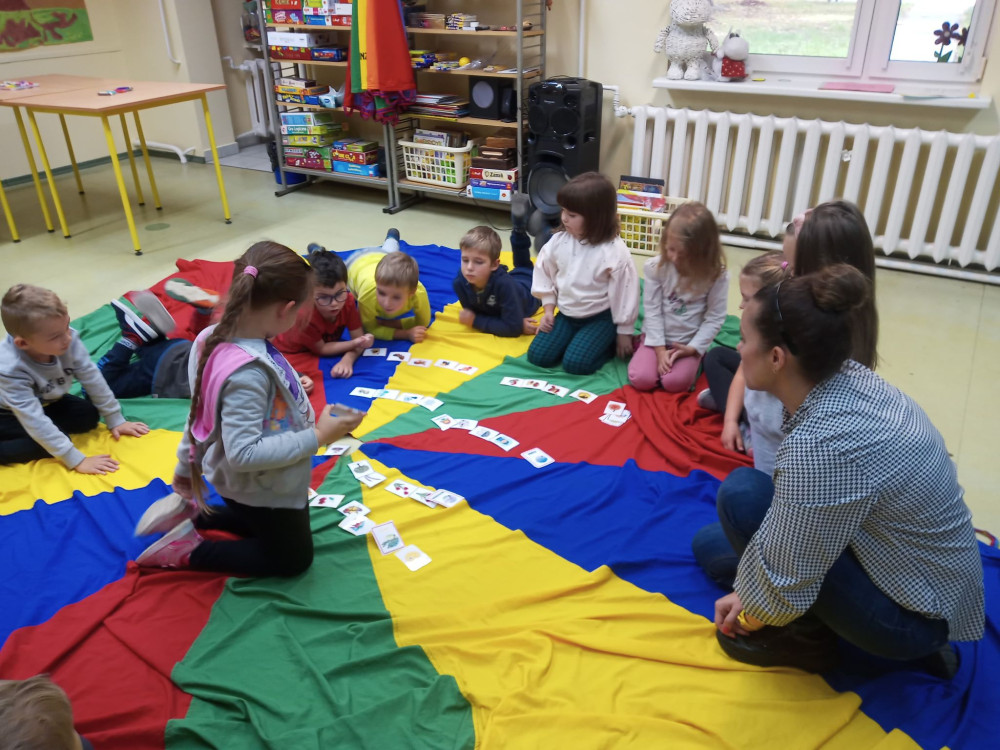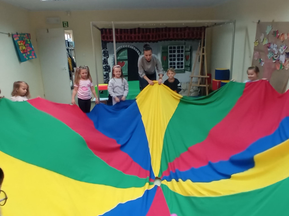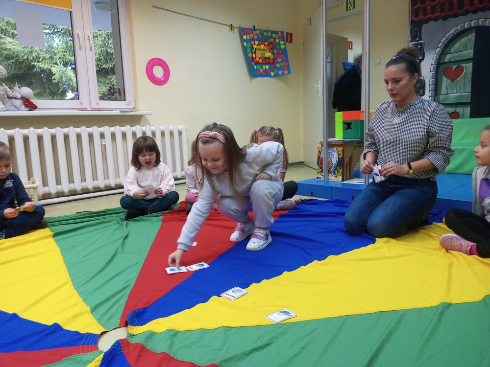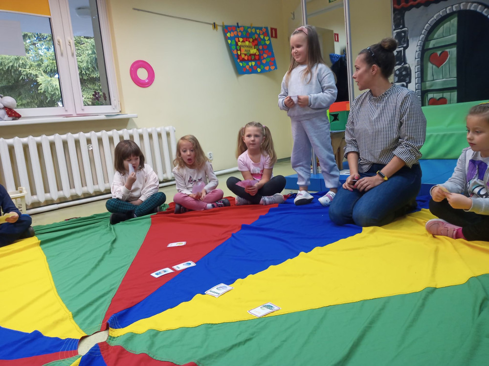Zaczarowana chusta zabrała przedszkolaki w podróż po porach roku – dzieci pięknie potrafiły nazwać i uporządkować oznaki jesieni, zimy, wiosny i lata.