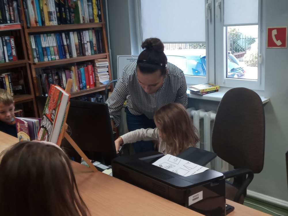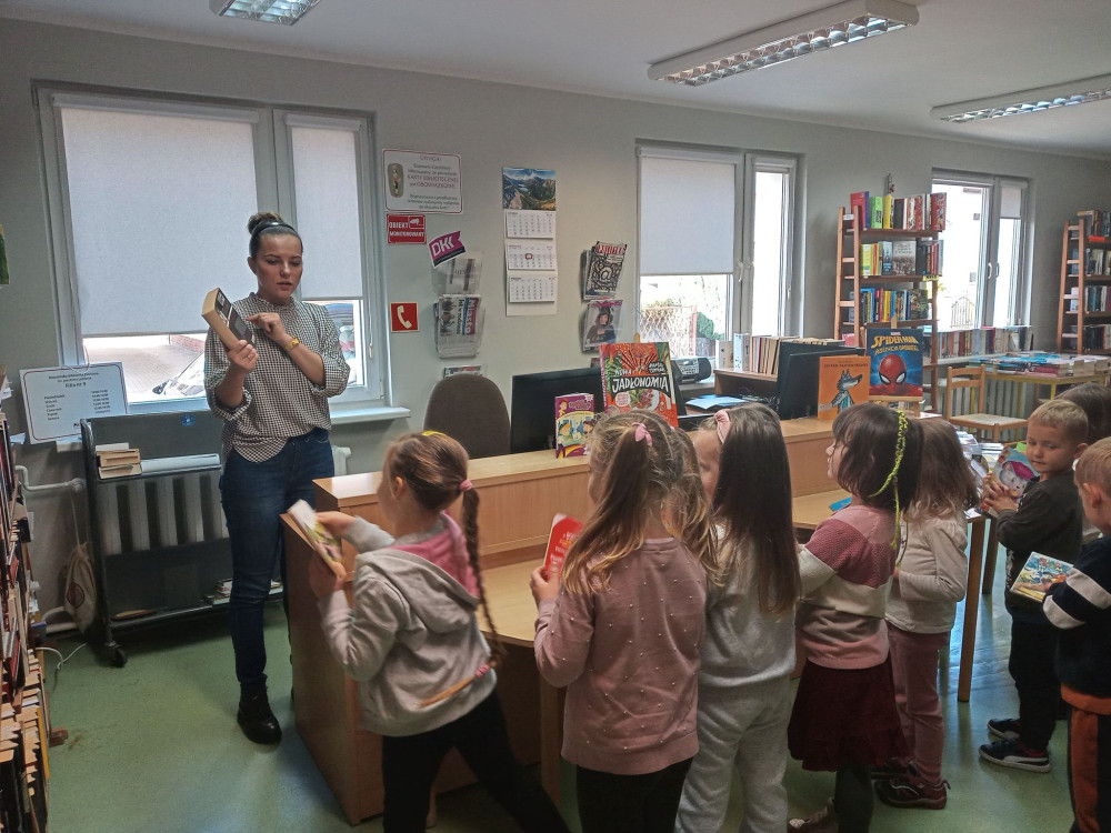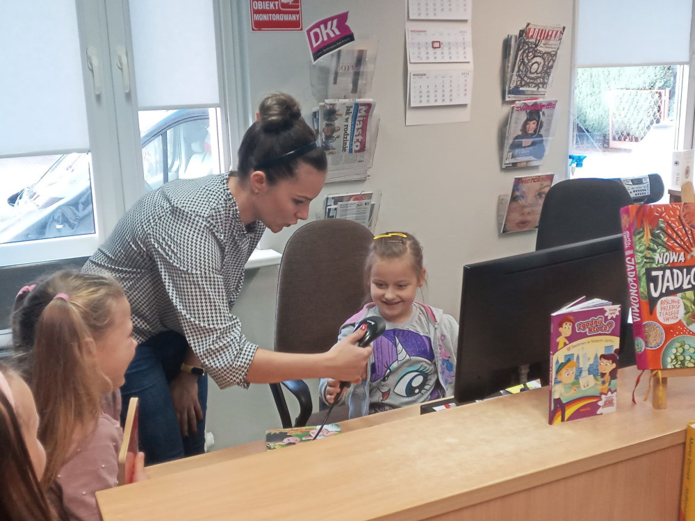 Dzieci wyruszyły na wycieczkę po naszej bibliotece – dowiedziały się co można robić w czytelni, poznały zasady wypożyczania książek. Dużą radość sprawiła dzieciom możliwość zeskanowania książki.
