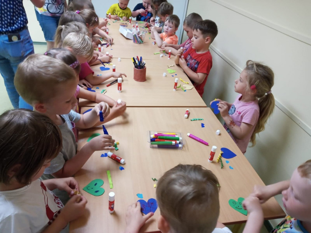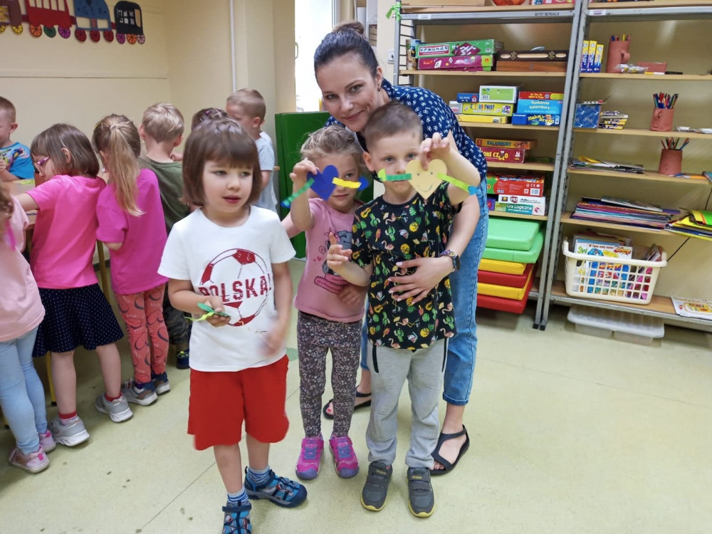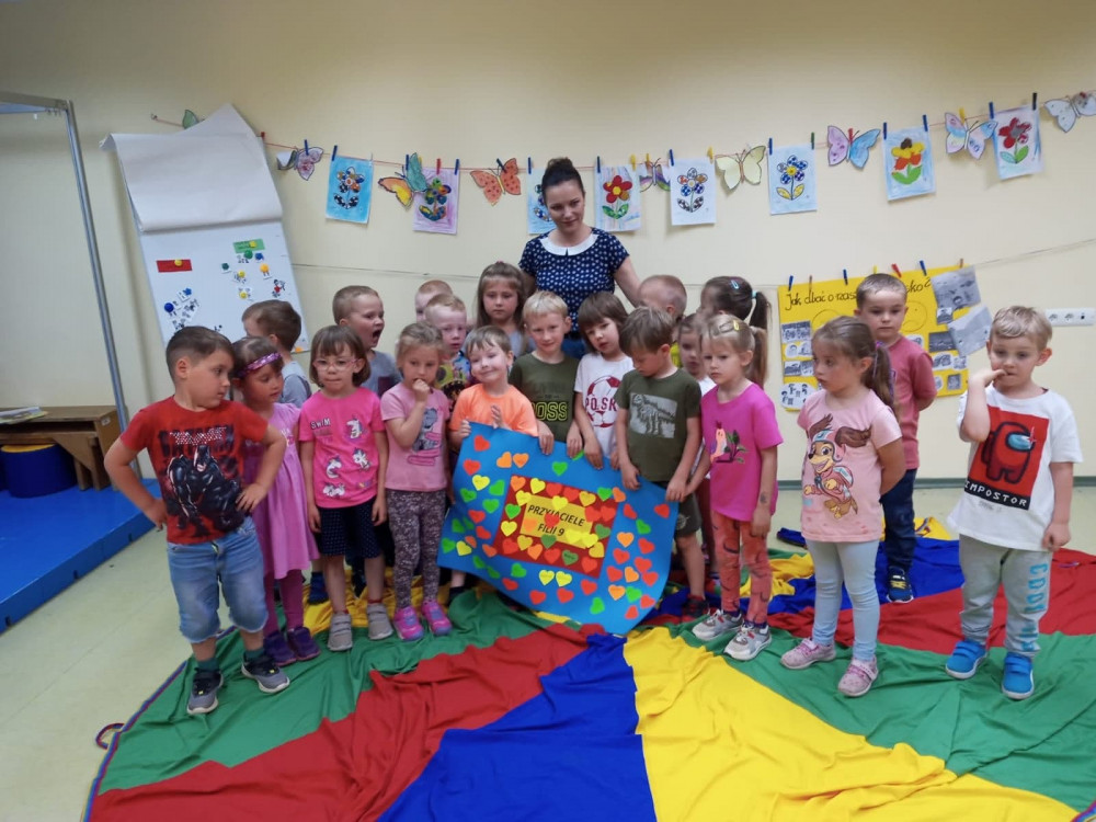 W trakcie szalonej zabawy, nie mogło zabraknąć - chusty animacyjnej. Wiewiórki znalazły czas na zrobienie serduszek do naszego plakatu – Przyjaciół Filii 9.