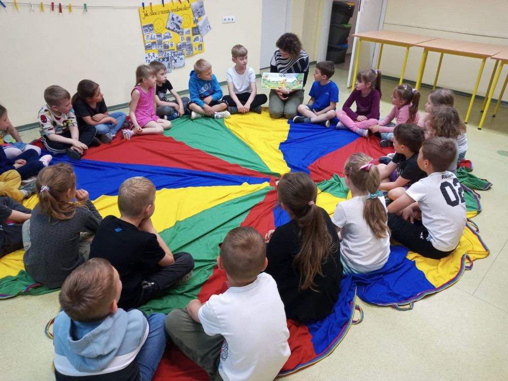 Czas uatrakcyjniła nam chusta animacyjna. Na koniec Ekoludki powiększyły, o swoje imiona, plakat przyjaciół filii 9.