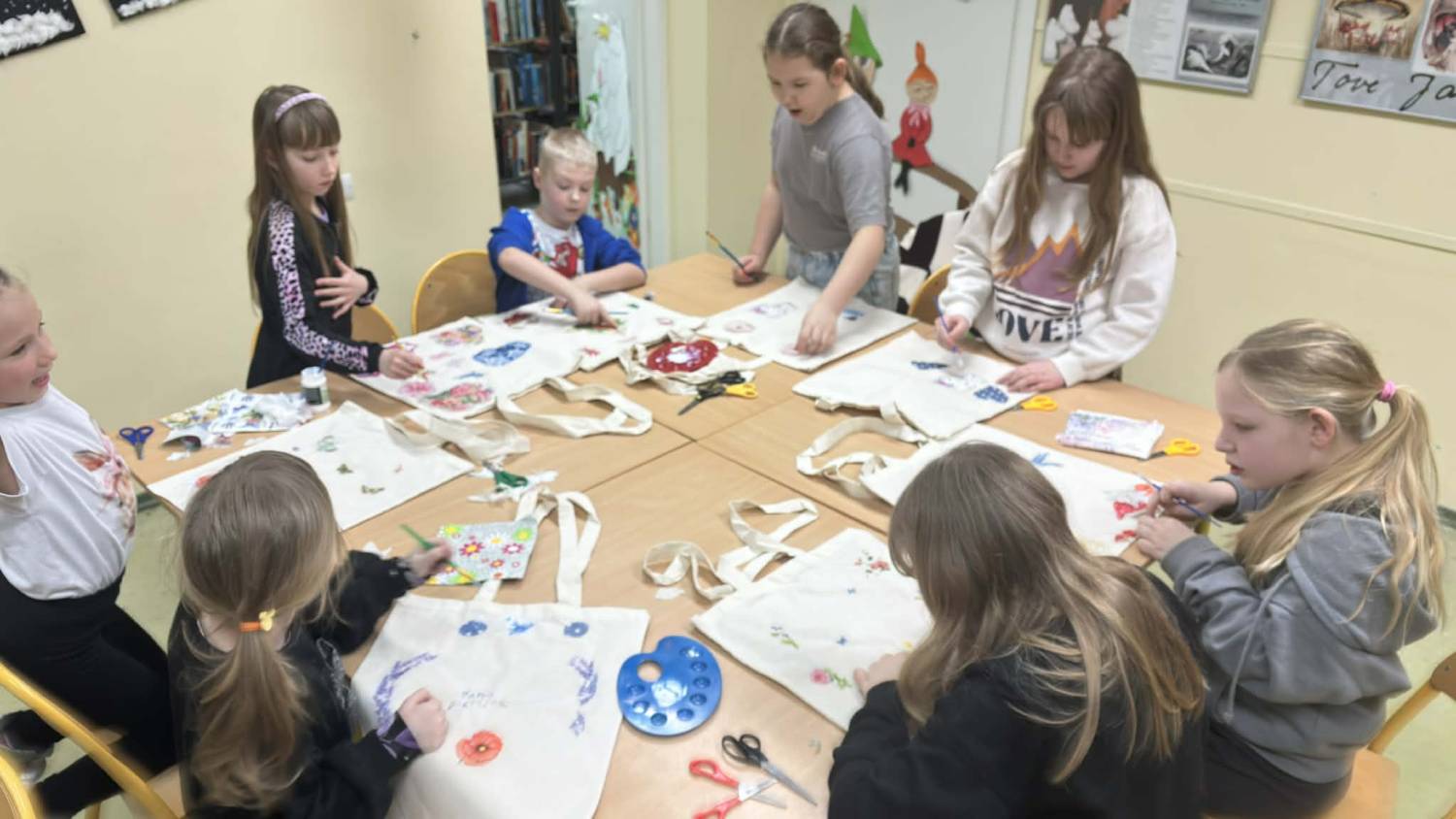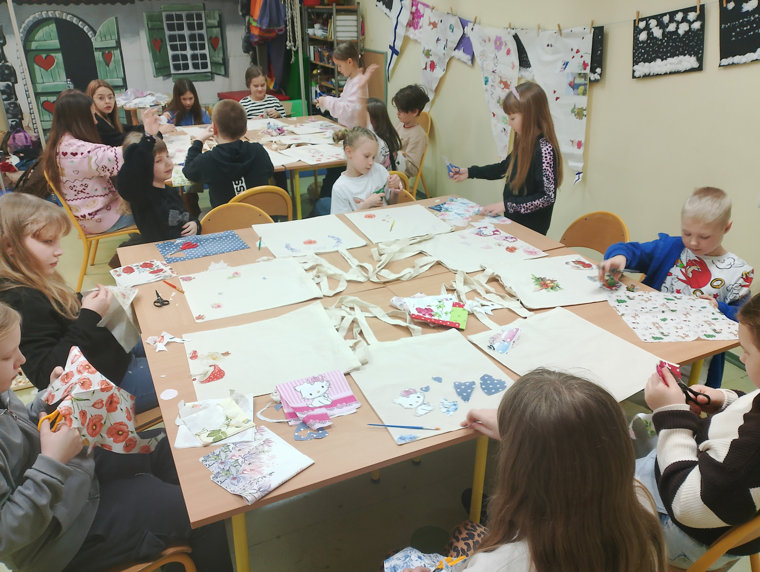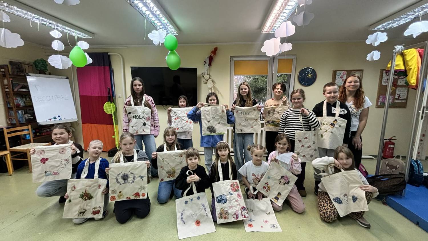 Podczas warsztatów decoupage dzieci zamieniły zwykłe bawełniane torby w prawdziwe, niepowtarzalne dzieła sztuki Było wycinanie, przyklejanie serwetek, dobieranie wzorów i kolorów — każda praca powstawała z ogromnym sercem i zaangażowaniem.