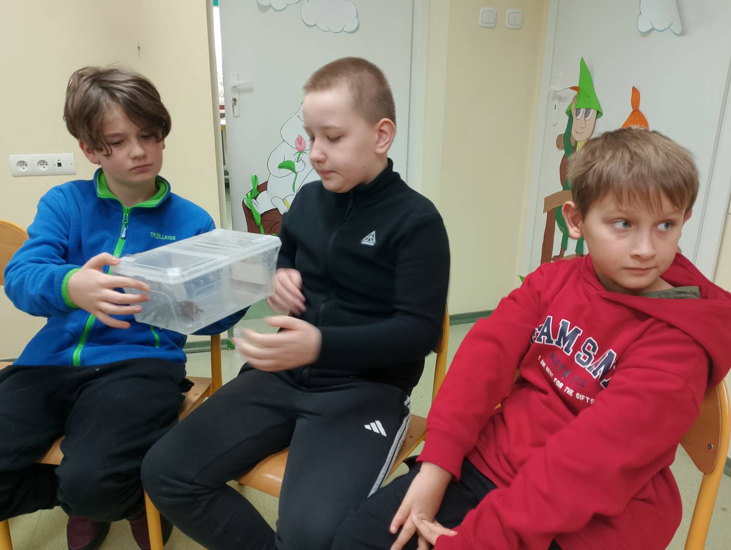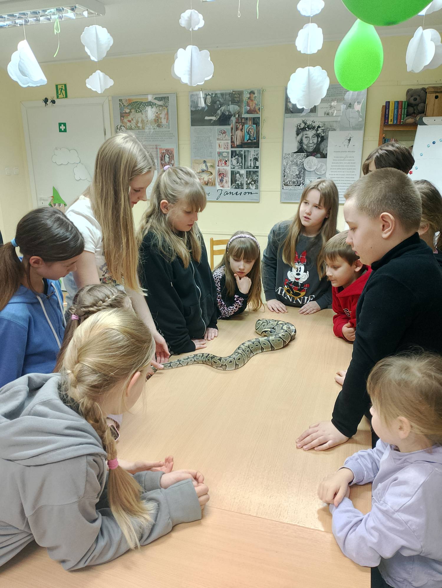 Dzisiejsze zajęcia były prawdziwą eksplozją wrażeń Warsztaty przyrodnicze prowadzone przez panią Wiktorię Tiece dostarczyły uczestnikom mnóstwa emocji i pozytywnej adrenaliny. Dzieci mogły z bliska zobaczyć niezwykłe stworzenia: karaczany, straszyki, ślimaka afrykańskiego, ptasznika czerwonokolanowego, a także pytona królewskiego. Zobaczcie sami - do odważnych świat należy – większość zwierząt można było dotknąć i wziąć na ręce! Radość mieszała się ze strachem, ale też ciekawością i ekscytacją. To były niezapomniane wrażenia!