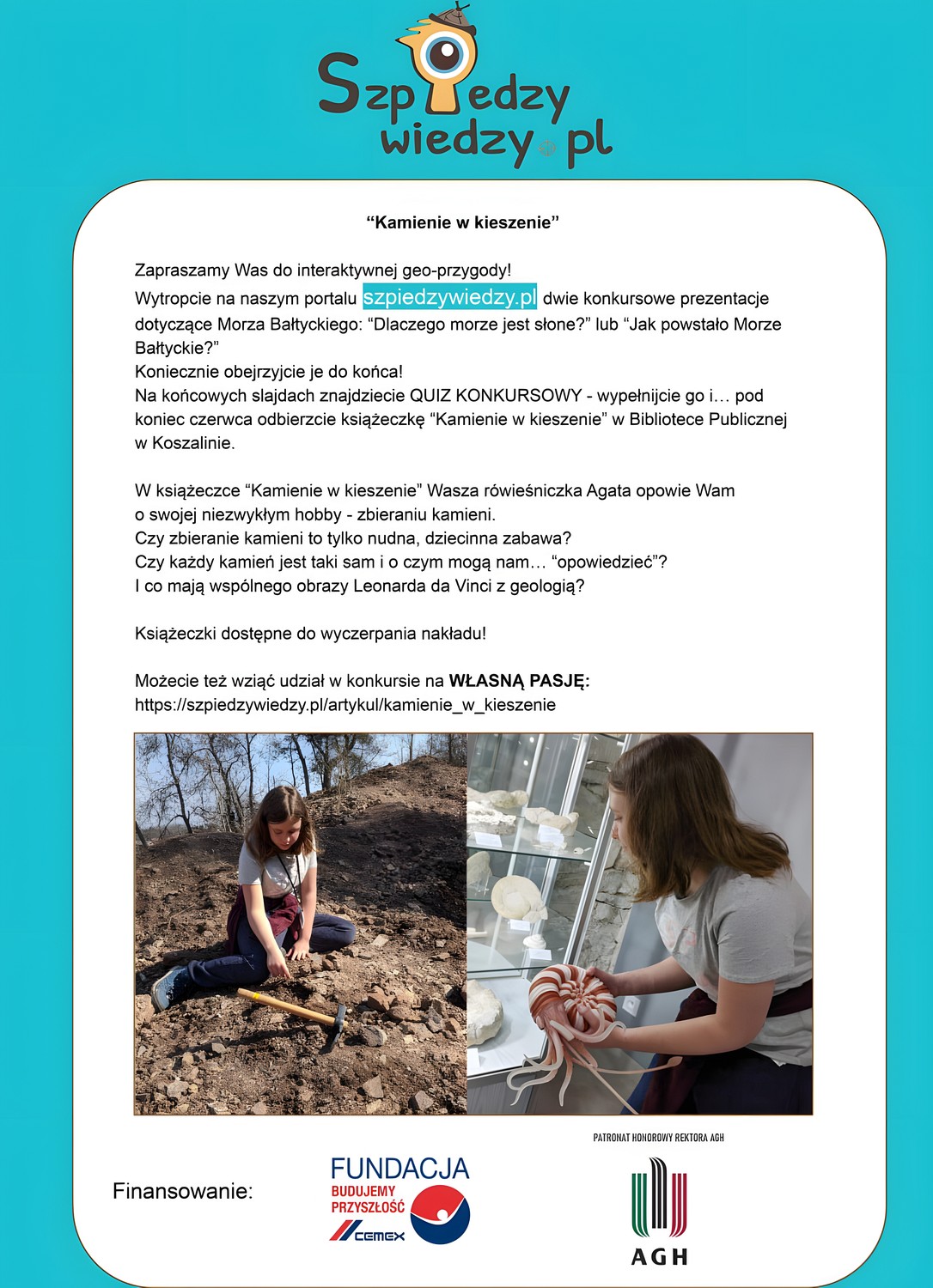 Nasza biblioteka bierze udział w projekcie "Kamienie w kieszenie", który jest kierowany do dzieci i młodzieży. W ramach projektu powstaną 4 interaktywne prezentacje, a dzieci, które wezmą udział w projekcie mogą otrzymać książeczkę "Kamienie w kieszenie" o tematyce geologicznej. Projekt kończy się w czerwcu. Książki będą do odebrania w naszych filiach.