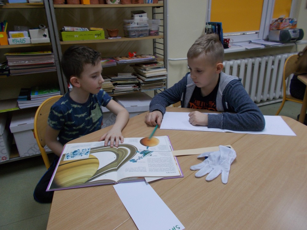 Dzieci dostały różne książki o kosmosie, z których robiły notatki do prezentacji i przygotowywały rysunki swoich wybranych planet.