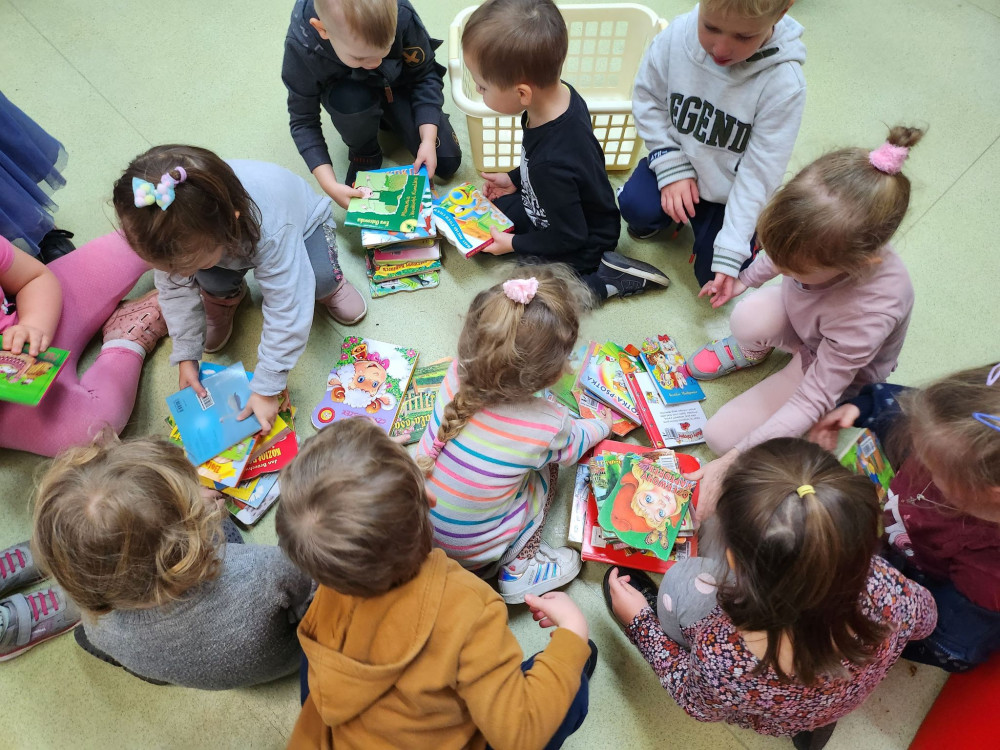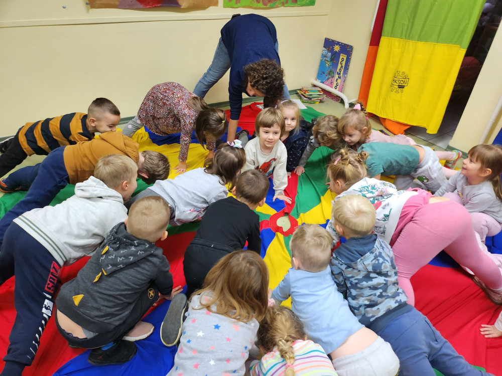 Podczas dzisiejszych zajęć nie mogło zabraknąć zabaw z chustą oraz konkursów z książeczkami. Przedszkolakom udało się stworzyć piękną, książkową wieże.