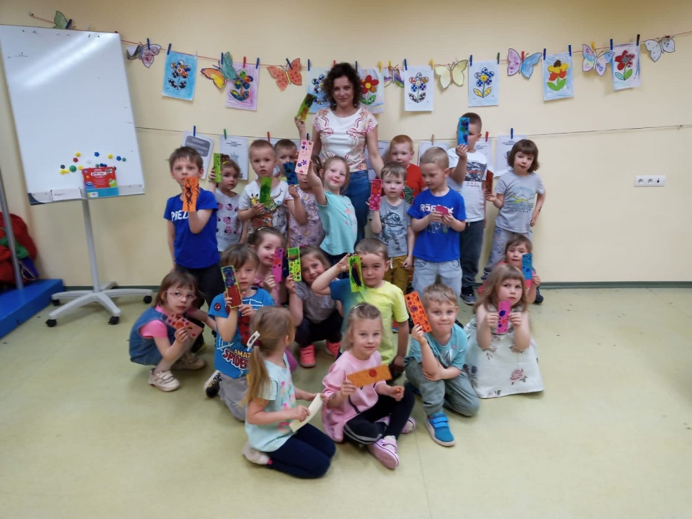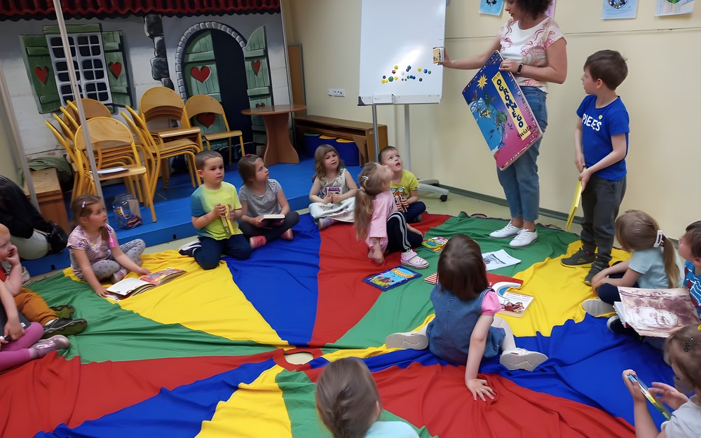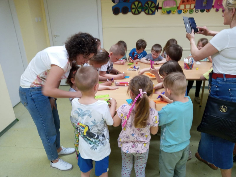 Podczas wizyty czterolatków nie zabrakło zabaw z chustą animacyjną. Na koniec, dzieci wykonały przepiękne zakładki, które wręczą swoim mamom, w dniu ich zbliżającego się święta.