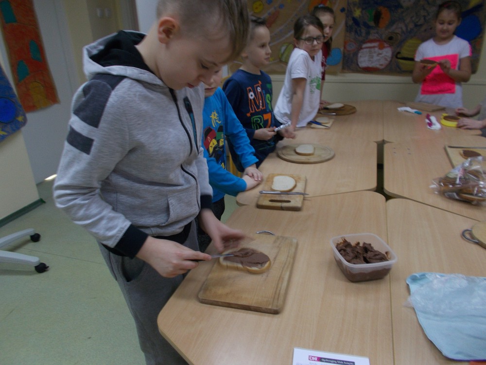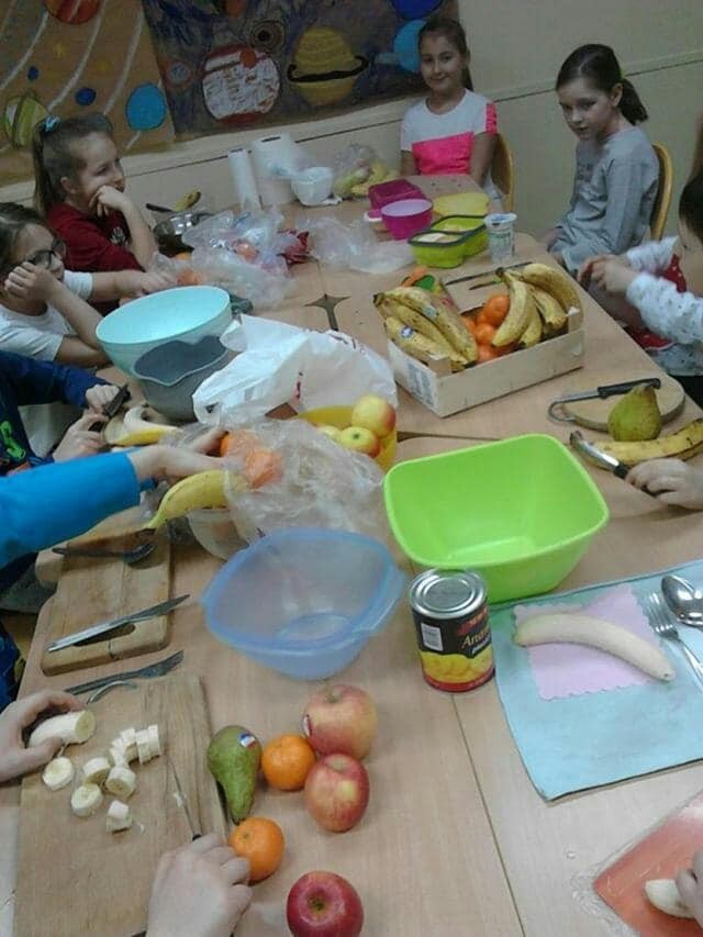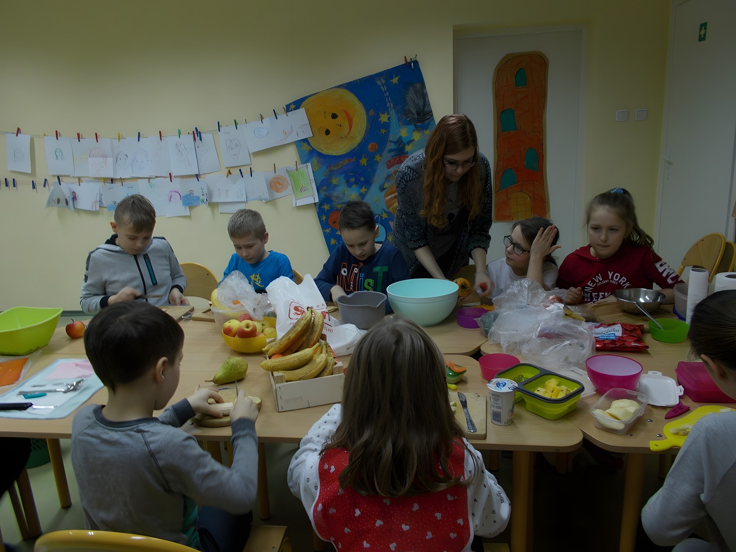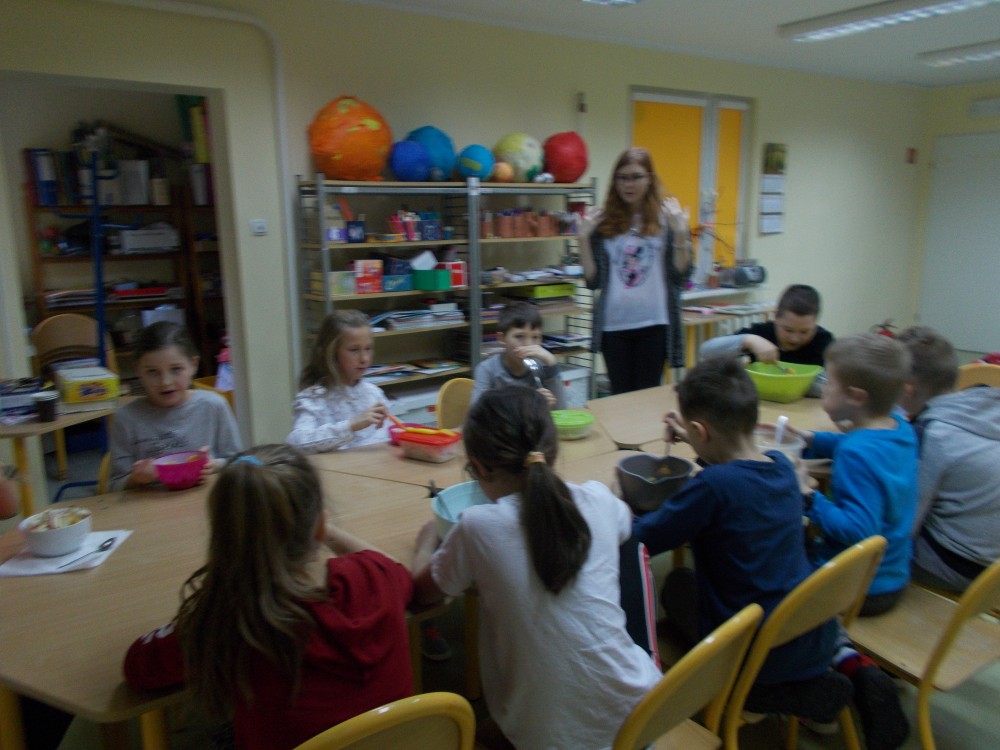 Ostatni dzień ferii w bibliotece zmieniliśmy w prawdziwe przyjęcie. Poznaliśmy zasady savoir-vivre'u, ćwiczyliśmy układanie sztućców, przygotowaliśmy wspaniałe sałatki, a nawet tańczyliśmy podczas dyskoteki.