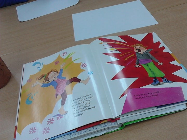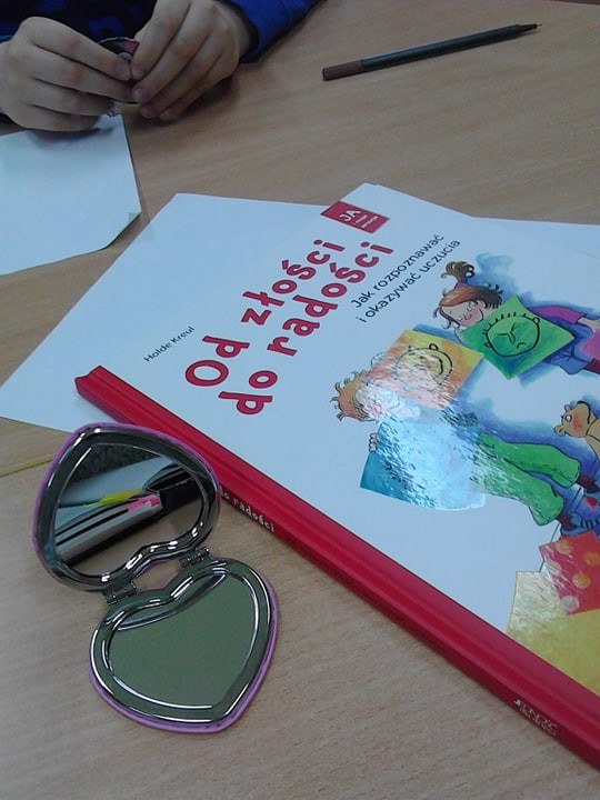 Podczas dzisiejszych zajęć rozmawialiśmy o emocjach. Zastanawialiśmy się, jakie emocje odczuwamy, w jakich sytuacjach i z jakich powodów. Próbowaliśmy też zobaczyć nasze emocje-miny w lusterkach, by móc je narysować. Czytaliśmy również książkę"Od złości do radości".
