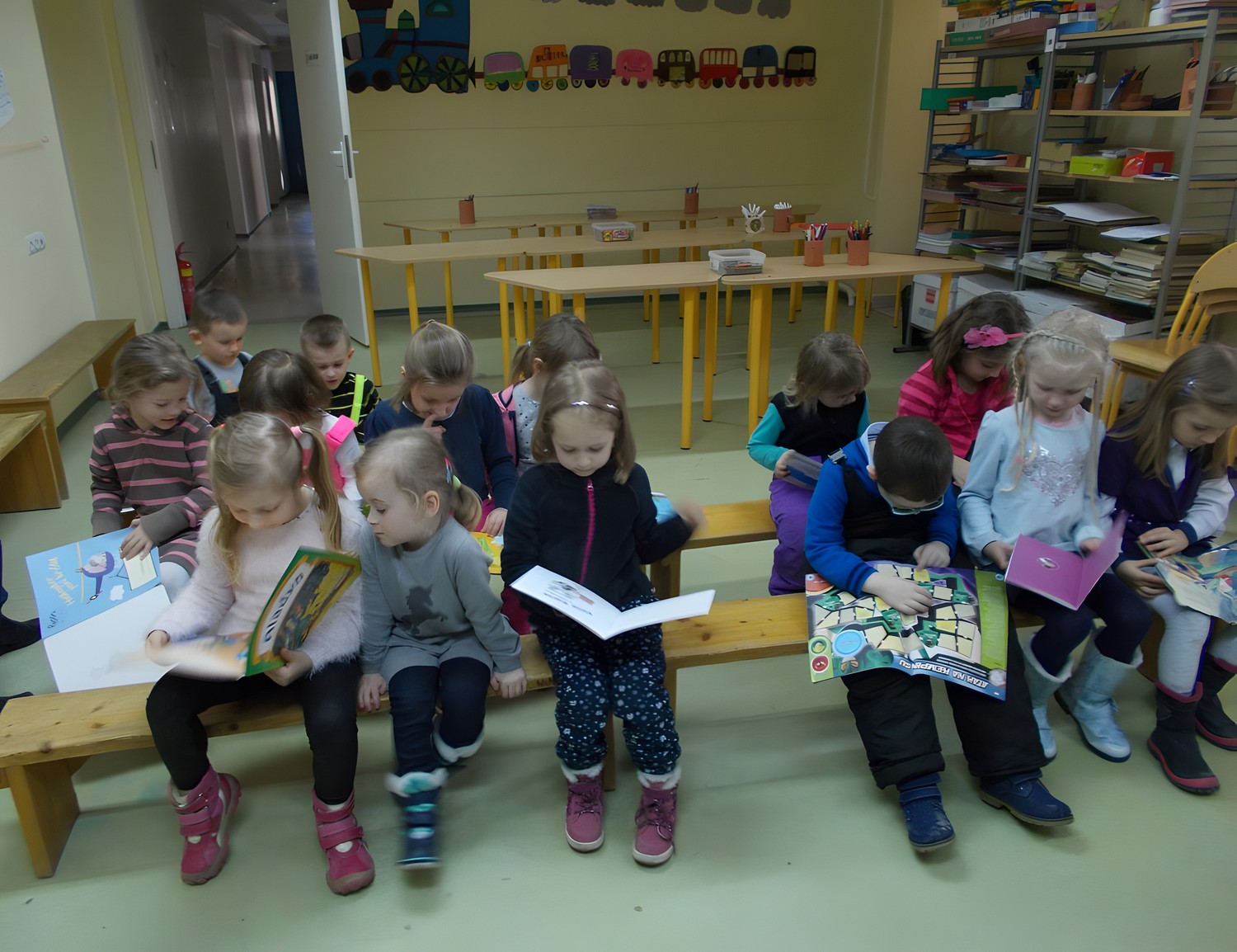 dzieci przemieszczają się po całej sali, żeby zająć wygodne miejsce