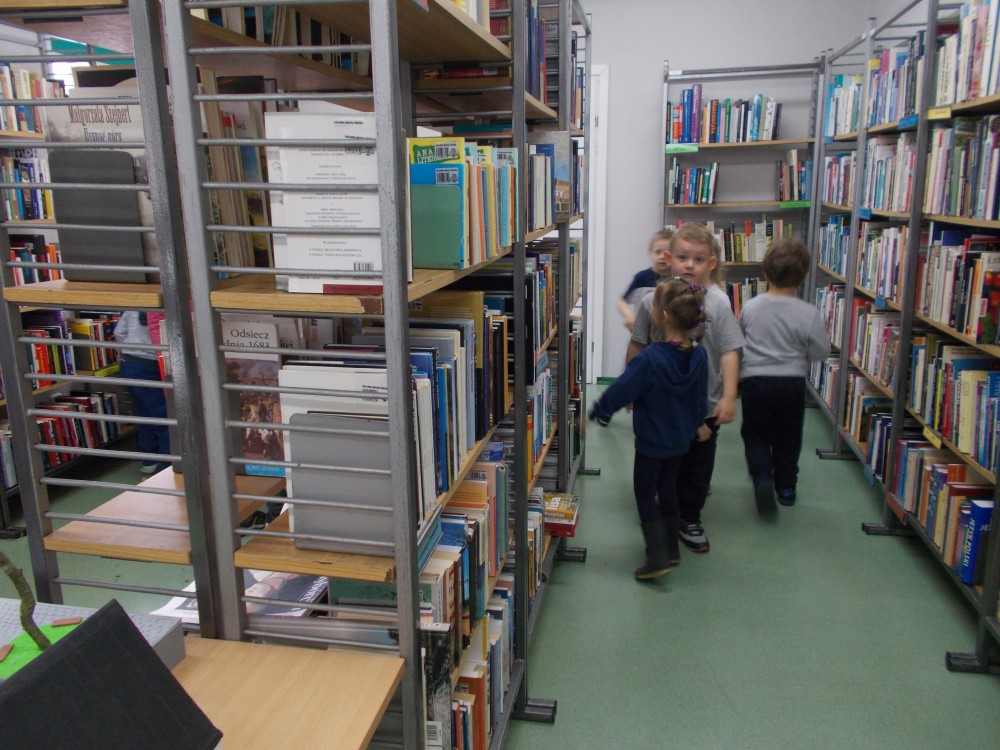 Dzieci między regałami w czytelni czują sie jak dorośli czytelnicy