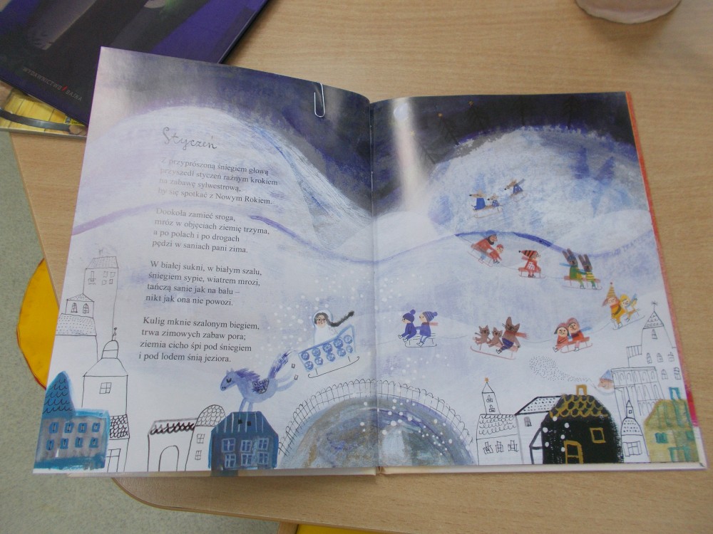 Brak śniegu to jednak nie zima, chociaż jest na nią pora. Na spotkaniu z dziećmi dużo rozmawialiśmy o śniegu, mrozie, bezpiecznych zjazdach na sankach, nartach i śmiganiu po lodowisku.