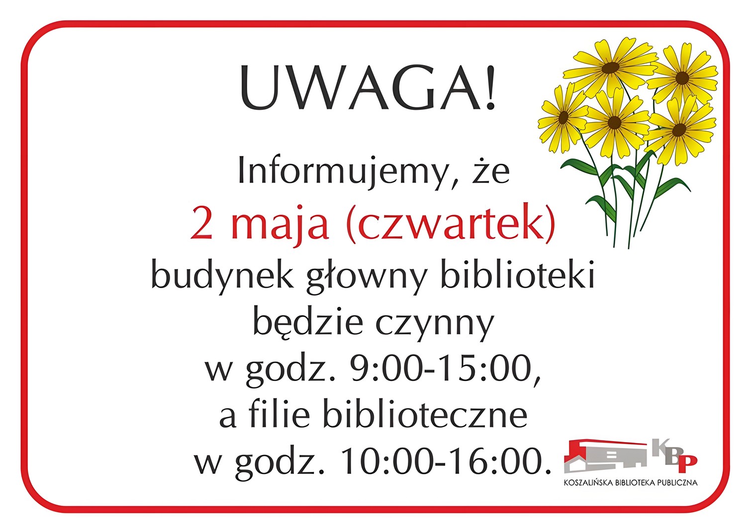 Informujemy, że 2 maja (czwartek) biblioteka będzie czynna w godz. 10:00-16:00.