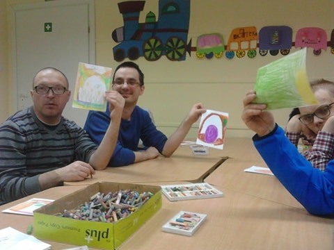 Dzisiejsze Warsztaty Terapii Zajęciowej miały szczególną atmosferę. Podopieczni wysłuchali książeczki "Deszcz śmiechu", opowiadali o sytuacjach, w których czują się szczęśliwi, a także stworzyli piękne wielkanocne kartki.