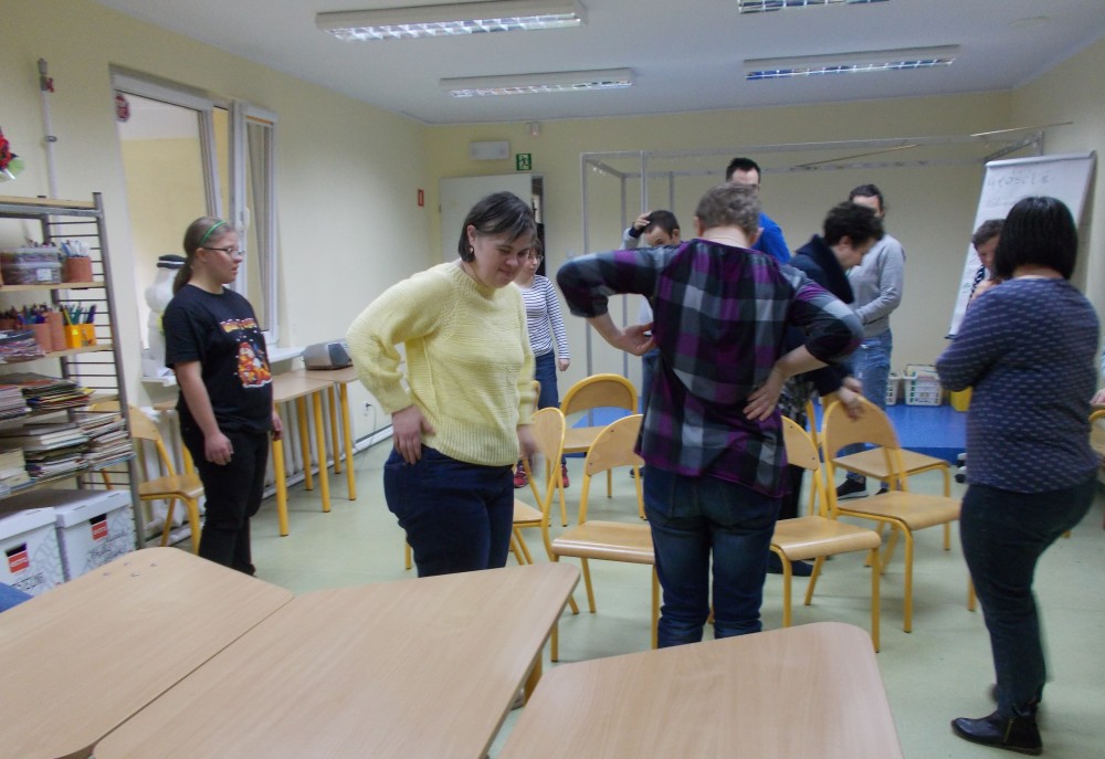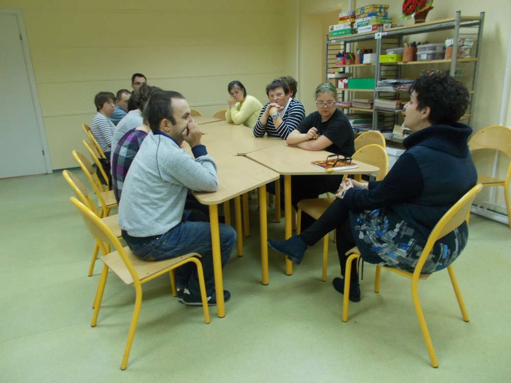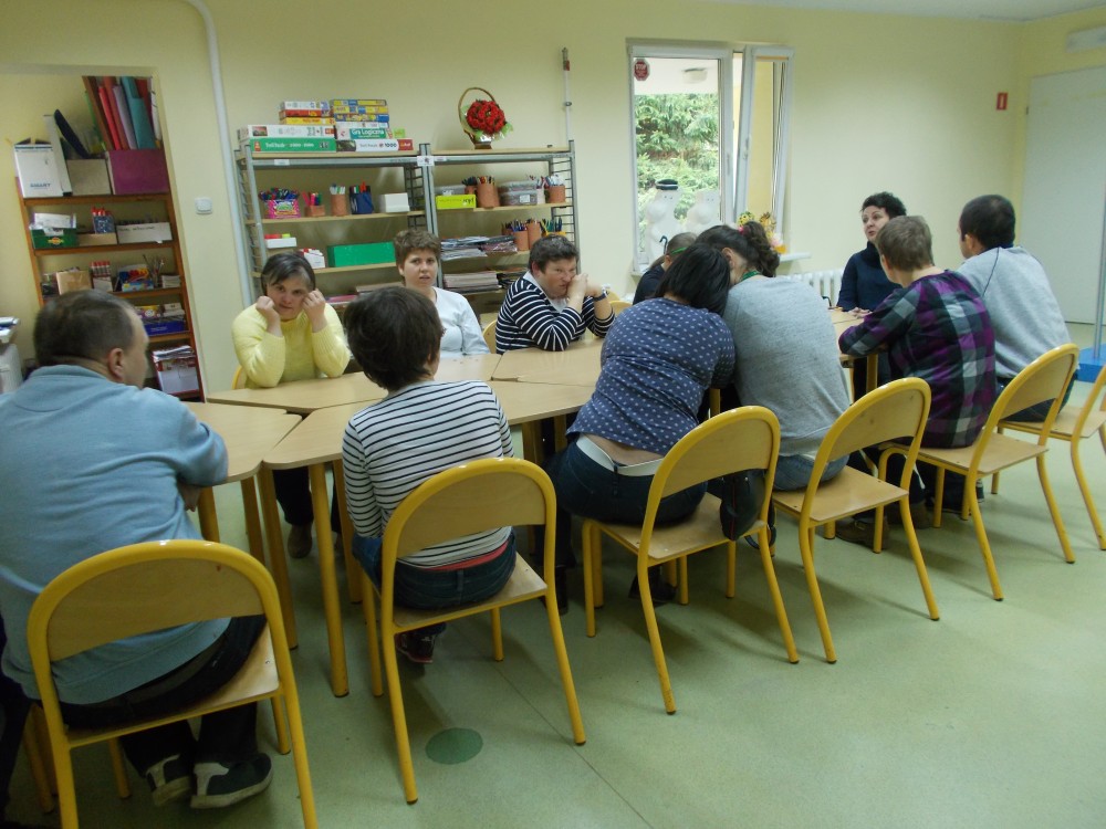 Podopieczni Warsztatów Terapii Zajęciowej na spotkaniu w bibliotece. Różne formy zabawy, czytanie wybranych opowiadań i rozmowy to również jest terapia, chociaż w tak małym zakresie.