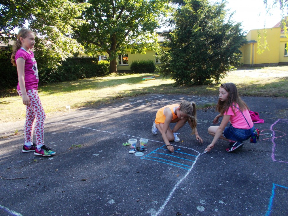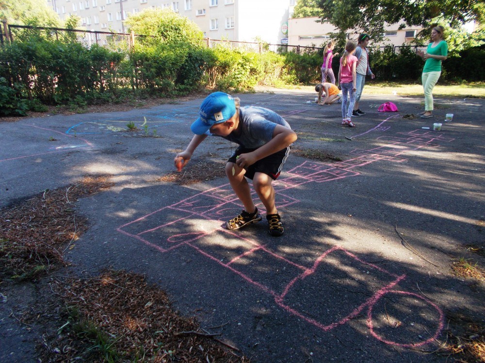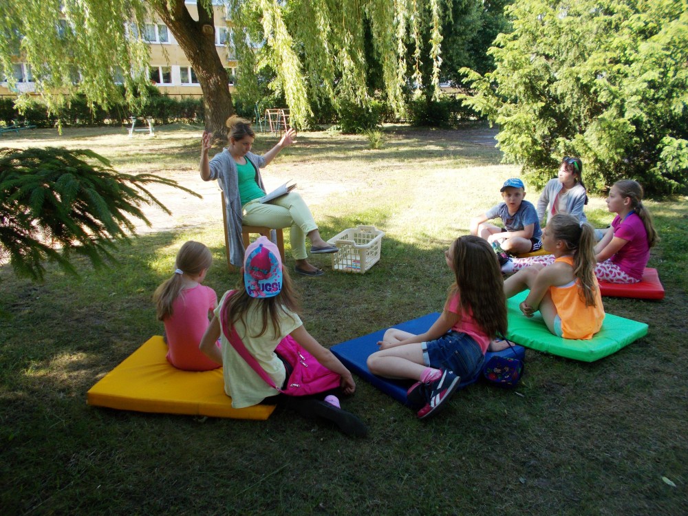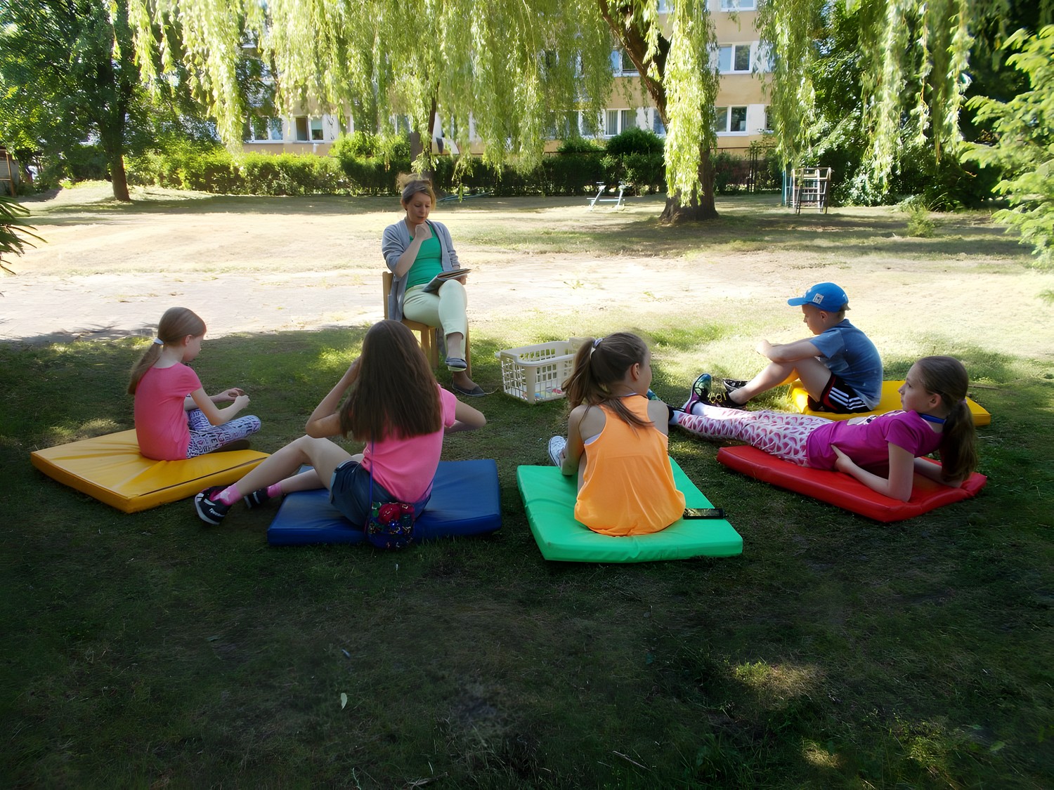 Piątkowe zajęcia przeprowadzone były w naszym zielonym ogrodzie i w cieniu przepięknych drzew trwała zabawa. Dzieci zapoznały się z książką "Dlaczego biedronka ma kropki?", wzięły udział w konkursie literackim i w zabawie z kredą.