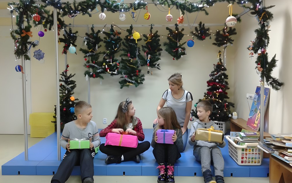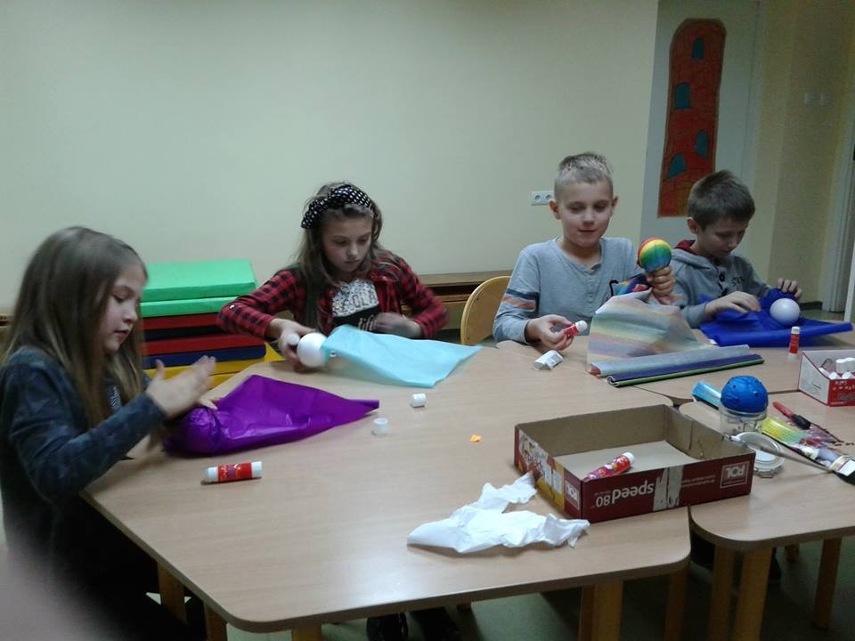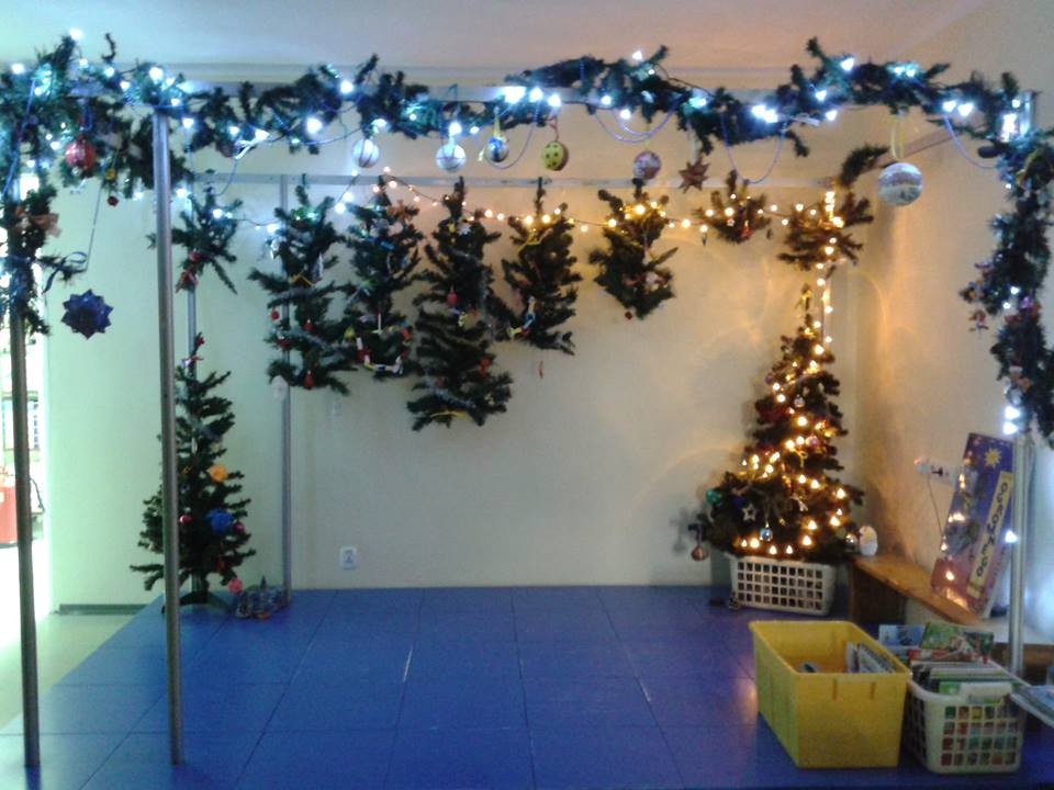 Zajęcia w bibliotece to nie tylko wspólne czytanie książek. Dzieci korzystają z każdej okazji do zabawy, prac plastycznych, rozwiązywaniu rebusów. Tym razem stroiliśmy scenę w sali Muminków na świąteczny czas i wywołało u wszystkich mnóstwo radości.