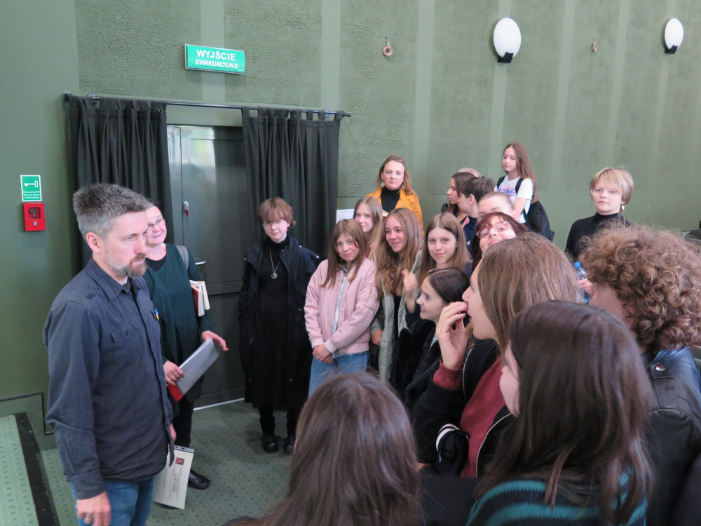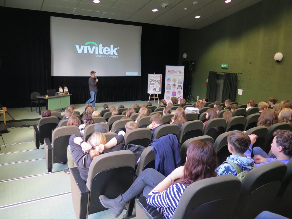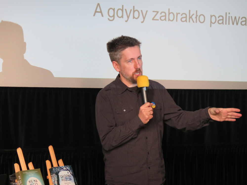 Spotkanie przeznaczone dla uczniów klas ósmych, miało charakter warsztatowy, dotyczący zagrożeń egzystencjalnych i klimatycznych, nawiązujący do cyklu książek "Pęknięte Niebo".