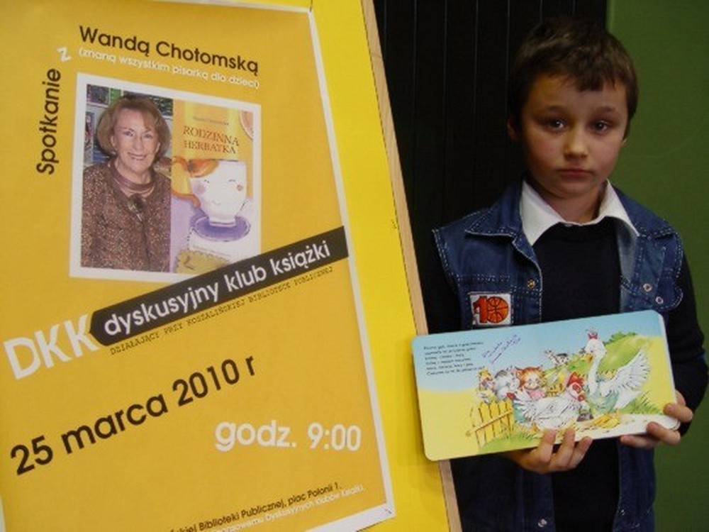 Dnia 25 marca 2010 r., o godz. 9:00 w sali konferencyjnej Koszalińskiej Biblioteki Publicznej odbyło się spotkanie z Wandą Chotomską, znaną wszystkim pisarką dla dzieci. Spotkanie odbyło się dzięki wsparciu finansowemu Dyskusyjnych Klubów Książki.